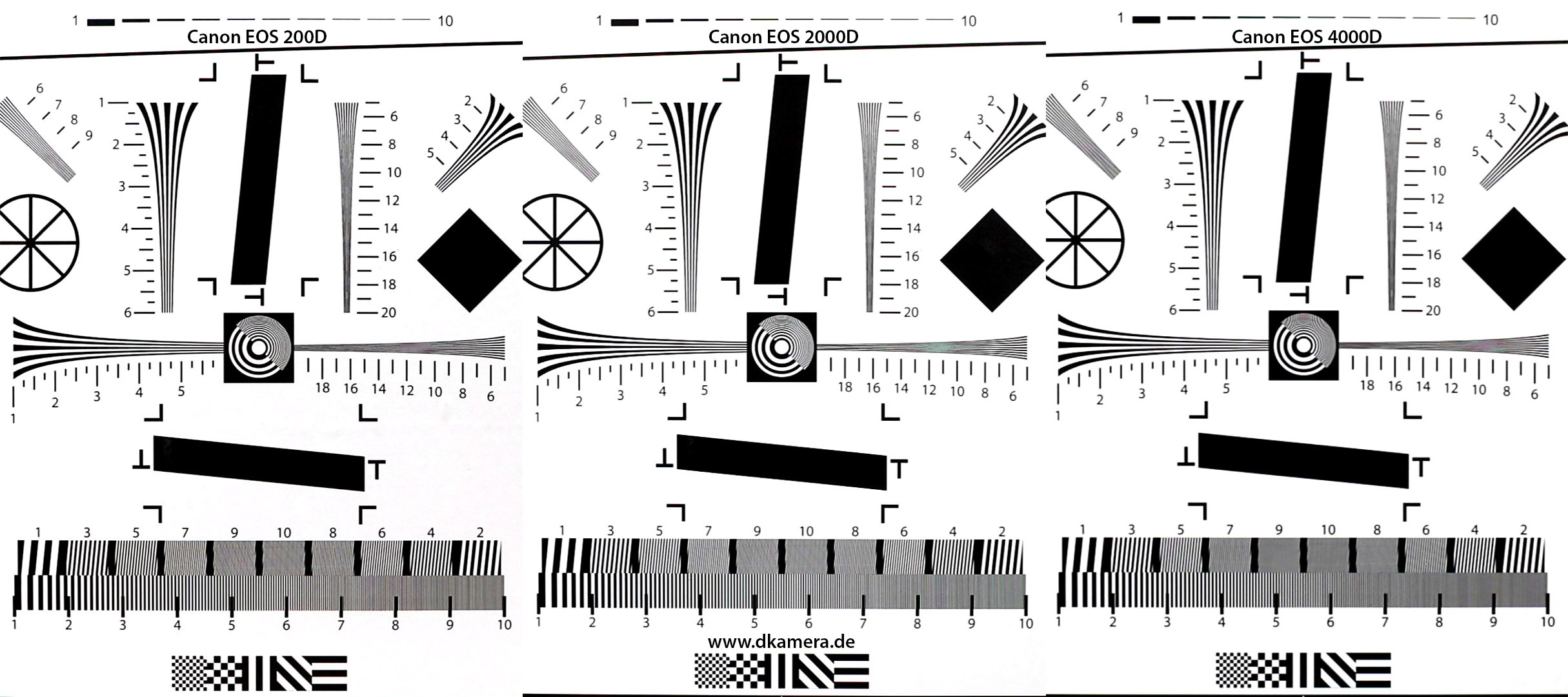 Die Phasen-AF-Systeme aller drei Kameras sind mit Ausnahme der etwas höheren Empfindlichkeit des Sensors der EOS 200D praktisch gleich, mit einem Kreuzsensor und acht weiteren Liniensensoren werden allerdings nur die Grundbedürfnisse abgedeckt. Sobald die Fokussierung bei hochgeklapptem Spiegel erfolgen soll, schneiden EOS 2000D und EOS 4000D wie bereits erwähnt deutlich schlechter als die EOS 200D ab.