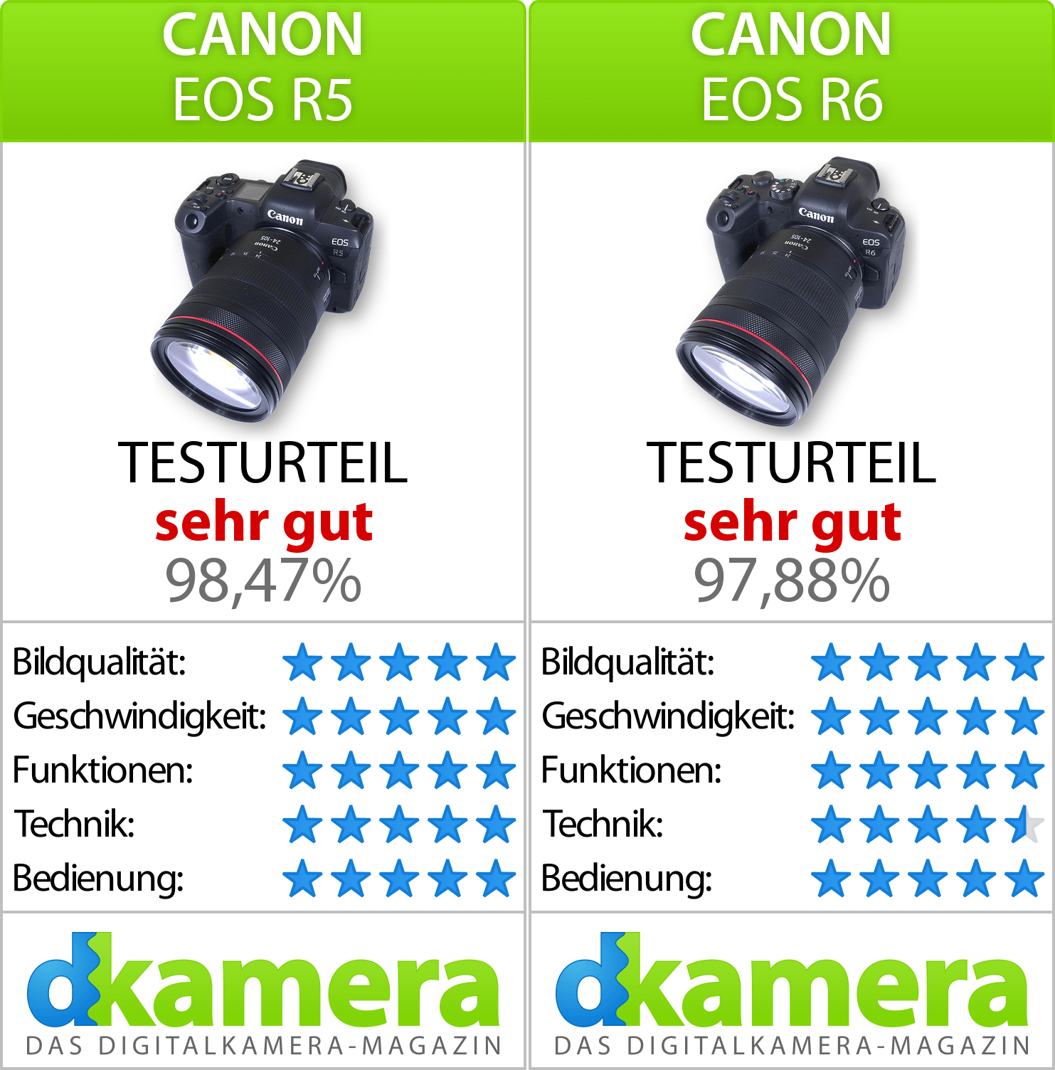 Am Ende kommt es darauf an, ob Foto- und natürlich auch Videografen die zusätzlichen Features der Canon EOS R5 benötigen. Nicht wenige werden diese Frage größtenteils verneinen können. Da die Canon EOS R6 im Handel nur ein wenig mehr als die Hälfte der Canon EOS R5 kostet, dürften viele Nutzer mit dem kleineren Modell besser fahren.
