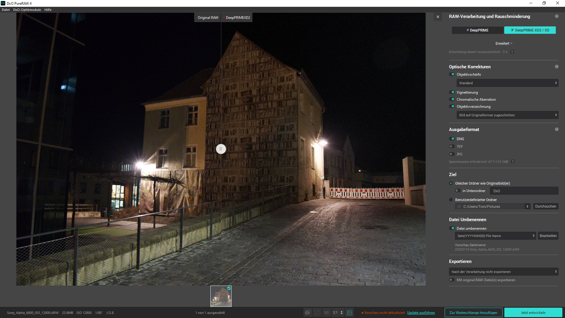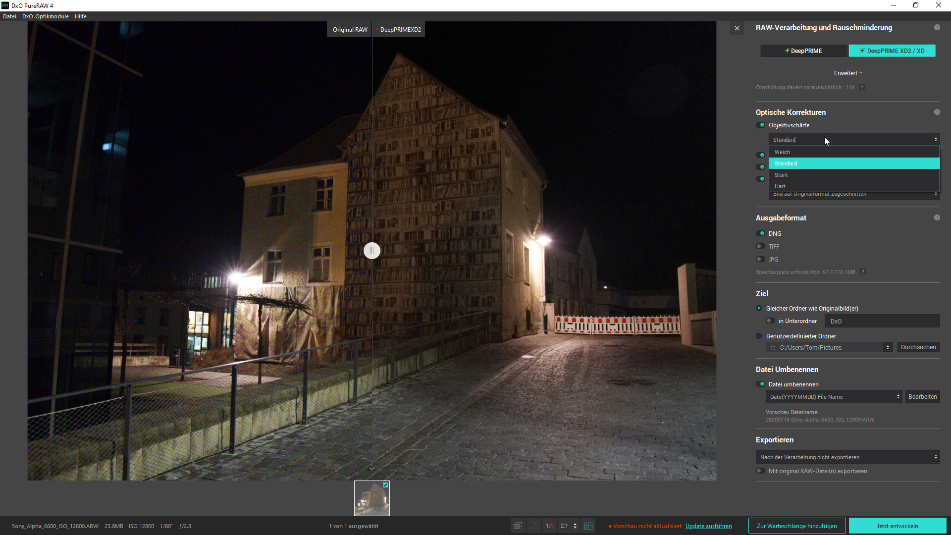 Zu den weiteren Optionen gehören die bereits angesprochenen Objektivkorrekturen. Bei der Vignettierung und den chromatischen Aberrationen kann man sich nur für das Aktivieren oder Deaktivieren der Korrektur entscheiden, bei der Objektivschärfe stehen „Weich“, „Standard“, „Stark“ und „Hart“ zur Wahl. Sofern die Verzeichnung korrigiert werden soll, kann man sich für „Bild auf Originalformat zuschneiden“, „Maximales Rechteck“ und „Bildbereich vervollständigen“ entscheiden. Dadurch bestehen beim späteren Zuschneiden mehr Optionen. Bei der Bildausgabe bietet DxO PureRAW 4 DNG, TIFF und JPEG an, für umfassende Nachbearbeitung sollte man sich hier natürlich für DNG entscheiden. Zu guter Letzt lassen sich der Speicherort, der Dateiname und der Export zu anderen Softwarelösungen konfigurieren. Wer mehrere Fotos mit DxO PureRAW 4 bearbeiten möchte, kann diese nach dem Starten der Software einfach in Oberfläche ziehen. Die Aufnahmen werden dann nacheinander abgearbeitet. Unterschiedliche Einstellungen waren im Test allerdings nicht möglich.