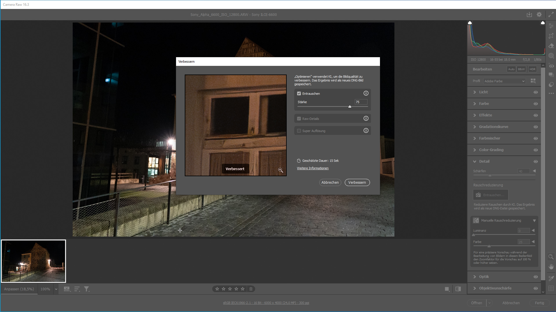 Bei der Bildbearbeitung mit Adobe Camera RAW findet sich die KI-Rauschreduzierung wie gewohnt bei „Details“. Hier darf man sich allerdings nicht für die manuelle Rauschreduzierung entscheiden, sondern muss den Button „Entrauschen“ drücken. Dann öffnet sich ein kleines Fenster mit Vorschaubild. Grundsätzlich sind in diesem Fenster auch die Optionen „RAW Details“ und „Super Auflösung“ vorhanden, wir wollen uns hier jedoch auf die Entrauschung konzentrieren.