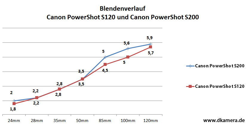 Die Objektive der beiden Kameras sind – wie bei allen Kompaktkameras – fest verbaut. Sie decken jeweils eine kleinbildäquivalente Brennweite von 24 bis 120mm ab. Vom Weitwinkel bis zum Telebereich ist man somit gut ausgestattet. Auch die Blendenöffnungen fallen sehr ähnlich aus, die Differenzen sind nur klein. So besitzt die „Canon Zoom Lens“ der Canon PowerShot S120 eine Lichtstärke von F1,8 bis F5,7, die der Canon PowerShot S200 von F2 bis F5,9. Unterschiede sind, wie unsere Vergleichstabelle zeigt, dabei hauptsächlich ab 50mm Brennweite (KB) anzutreffen. Aber selbst hier liegt die Canon PowerShot S120 maximal eine drittel Blendenstufe vorne. In der Praxis ist die lichtstärkere Blendenöffnung der Canon PowerShot S120 somit fast vernachlässigbar. Bei den Bildstabilisatoren messen wir jeweils eine Kompensationsleistung von etwa drei Blendenstufen.