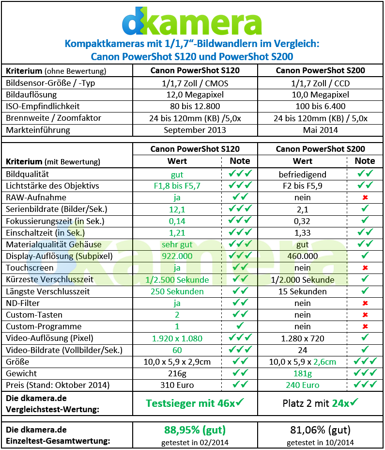 Eine bereits seit Jahren bekannte Kameraserie für Fotografen mit gehobenen Ansprüchen ist die PowerShot-S-Reihe von Canon. Mit der PowerShot S120 hat Canon hier ein bekanntes und beliebtes Modell im Programm. Mit einem Preis im höheren dreistelligen Eurobereich, ist die PowerShot S120 allerdings nicht für alle bezahlbar. Als etwas günstigere Alternative bietet Canon daher die PowerShot S200 an. Wir haben uns beide Digitalkameras genauer angeschaut und getestet, wie sie sich im direkten Vergleich schlagen.