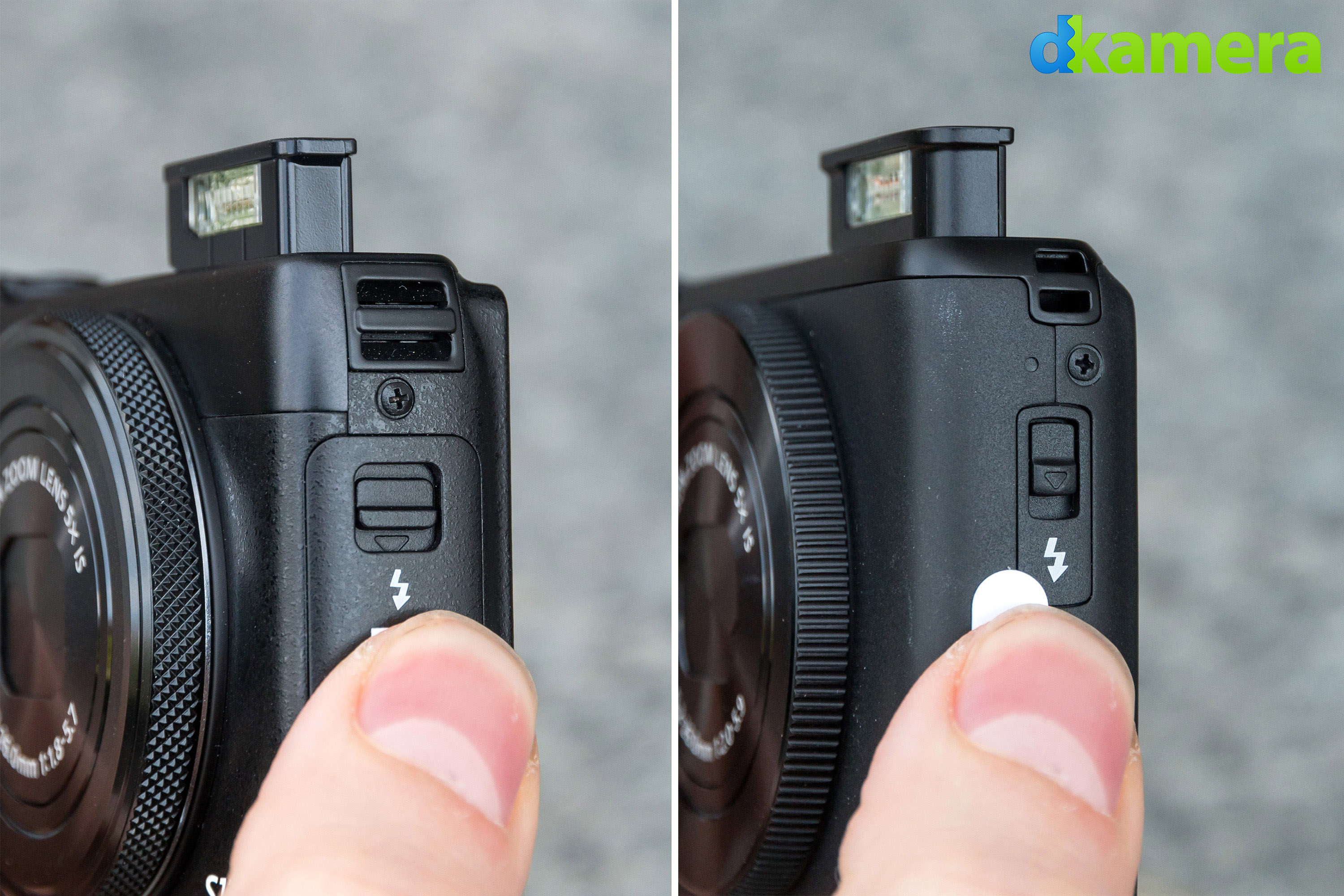Jeweils per Taste werden die integrierten Blitzgeräte aufgeklappt. Weitere Konfigurationsmöglichkeiten werden dann über das Blitzmenü angeboten.