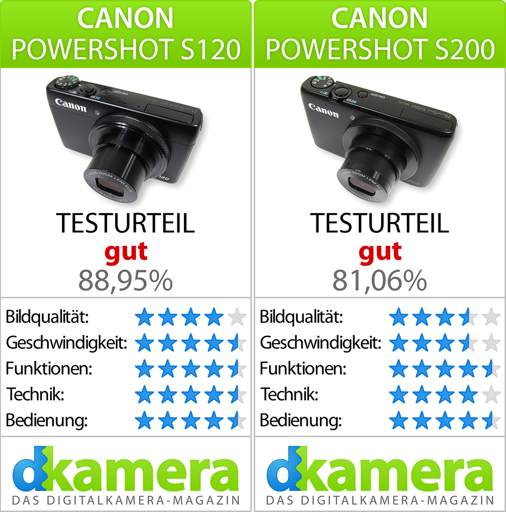 Zusammengefasst lässt sich festhalten. Die Canon PowerShot S120 bietet in fast allen Punkten mehr als die Canon PowerShot S200. Die Vorteile sind zwar nicht immer groß, insgesamt liefert die S120 jedoch das deutlich bessere Gesamtpaket ab. Aufgrund des aktuell nur kleinen Preisunterschiedes von 70 Euro, würden wir daher zur Canon PowerShot S120 raten. Wer weder eine besonders schnelle Serienbildfunktion noch eine gute Bildqualität bei Videos erwartet, kann mit der Canon PowerShot S200 aber durchaus etwas sparen.