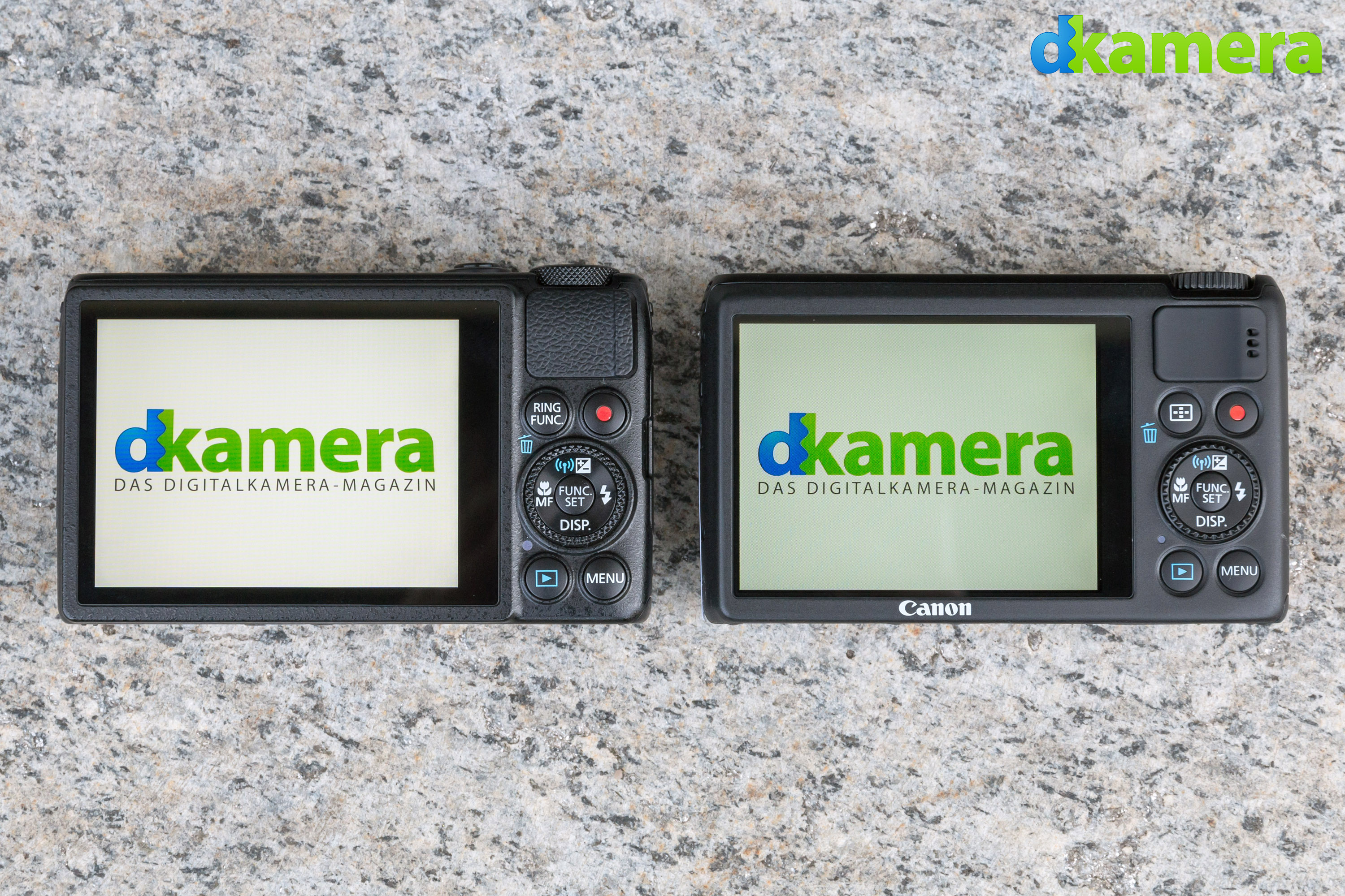 Da beide Kompaktkameras jeweils nur über ein Display verfügen, ist bei beiden die Bildkontrolle auch nur darüber möglich. Das LCD der Canon PowerShot S120 ist 3,0 Zoll groß und löst hohe 922.000 Subpixel auf. Die Detailwiedergabe des Displays ist daher sehr gut, feine Details werden gut aufgelöst. Zudem sind auch die eingeblendeten Schriften und Symbole scharf. Bei der Canon PowerShot S200 ist dies etwas anders. Auch ihr LCD besitzt eine Diagonale von 3,0 Zoll, die Auflösung liegt allerdings nur bei 460.000 Subpixel – und somit bei der Hälfte im Vergleich zur S120. Dies wird in deutlich schlechter aufgelösten Symbolen und Schriften sichtbar, zudem ist die Liveansicht deutlich pixeliger. Auch mit dem LCD der Canon PowerShot S200 lässt sich arbeiten, aber die Ansichtsqualität der Canon PowerShot S120 gefällt uns deutlich besser. Keine Unterschiede gibt es bei den Einblickwinkeln. Diese fallen sowohl bei der S120 als auch der S200 groß aus. Man kann daher auch von der Seite, oder von oben und unten, ohne größere Probleme die Aufnahmen kontrollieren. Durch die fest verbauten LCDs, die sich weder drehen noch klappen lassen, muss man hier aber natürlich des Öfteren stärkere Spiegellungen in Kauf nehmen. Etwas verwundert waren wir über die Farbwiedergabe des LCDs bei der PowerShot S200. Obwohl beide Kameras dasselbe Bild wiedergeben, wirkt dieses bei der S200 deutlich "grünstichig".