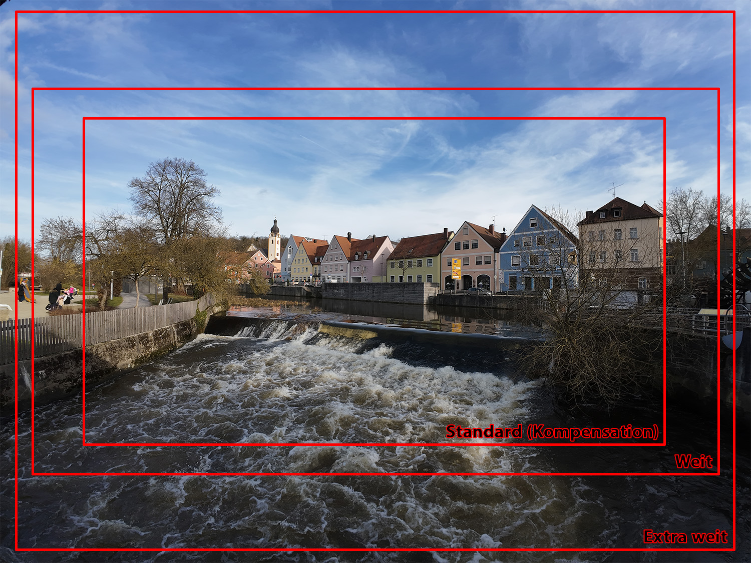Einstellbar ist bei der DJI Osmo Action 4 natürlich auch das Sichtfeld. Das weiteste davon nennt sich "Extra weit“ (etwa 11mm Brennweite, der genaue Wert hängt jedoch von den weiteren Einstellungen ab), das weite Sichtfeld gibt DJI mit rund 12mm Brennweite an. Hier sind jeweils deutliche Verzerrungen zu erkennen. Wer gar keine Verzerrungen sehen möchte, entscheidet sich für das Standard-Sichtfeld mit Kompensation (circa 15mm KB). Als weitere Option gibt es das schmale Sichtfeld mit circa 24mm KB-Brennweite. Da die Kamera hier nur einen kleinen Sensorbereich nutzt, lässt sich diese Sichtfeld-Option allerdings nur bei Full-HD- und 2,7K-Auflösung einstellen. Gut zu wissen: Wer sich für Videos ohne Stabilisierung entscheidet, kann diese nachträglich mittels der hier enthaltenen Gyroskop-Daten stabilisieren.