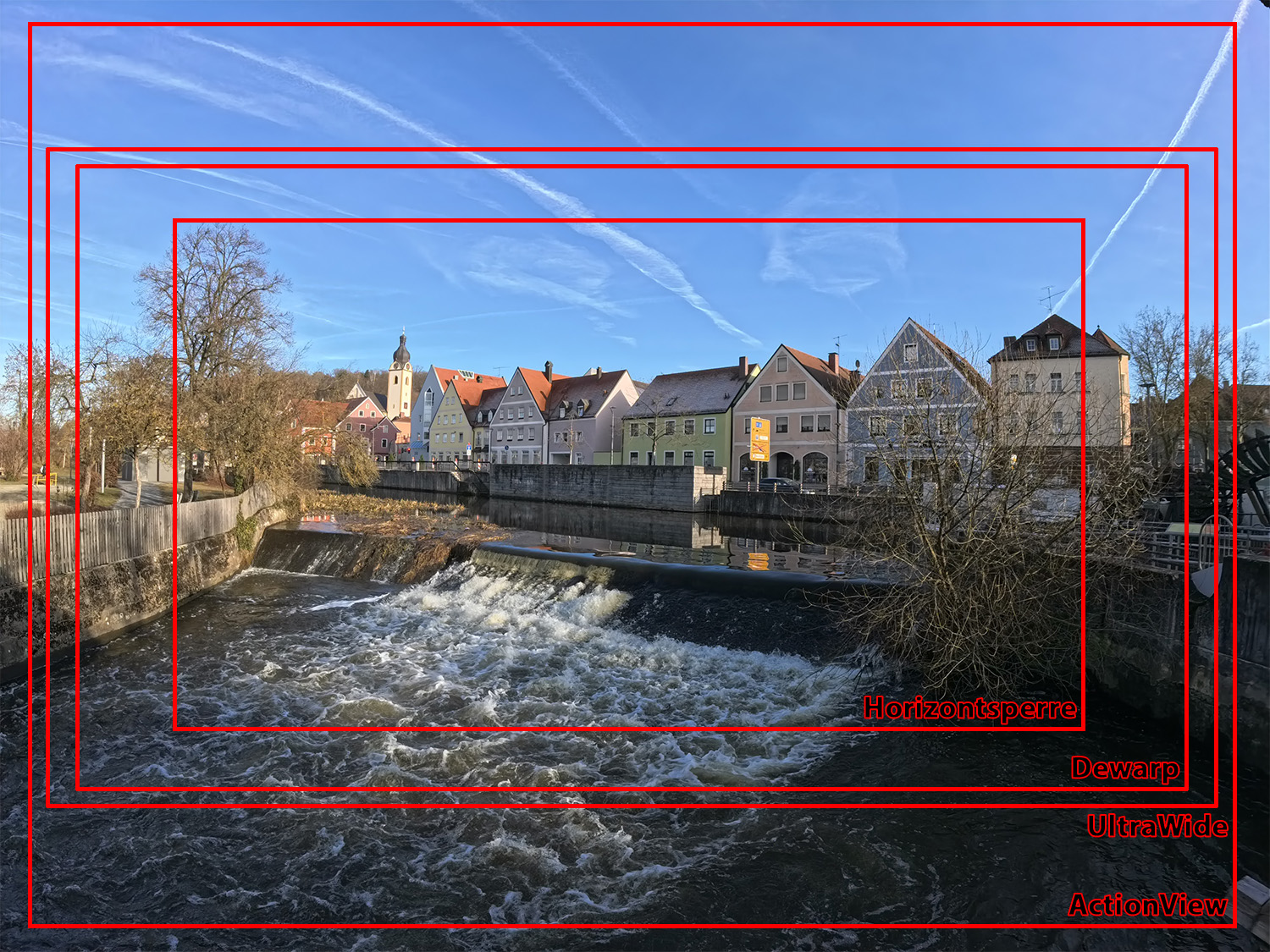 Wie bei der Insta360 Ace Pro und anderen Actionkameras werden auch bei der Ace unterschiedliche Sichtfeld-Optionen angeboten. Das „ActionView“-Sichtfeld fällt am weitwinkeligsten aus, durch die Bildfeldkompression sind Motive an den Rändern auch aber etwas stärker verzerrt. Beim „UltraWide“-Sichtfeld ist das wegen des „natürlichen“ Bildfelds des Objektivs nicht der Fall, die klassischen Fisheye-Verzerrungen sind aber selbstverständlich vorhanden. Diese lassen sich beim Verwenden des „Dewarp“-Sichtfeldes minieren. Das kleinste Sichtfeld nennt sich Horizontsperre. Ist dieses aktiviert, wird das Drehen der Kamera (bis zu etwa 45 Grad) ausgeglichen.