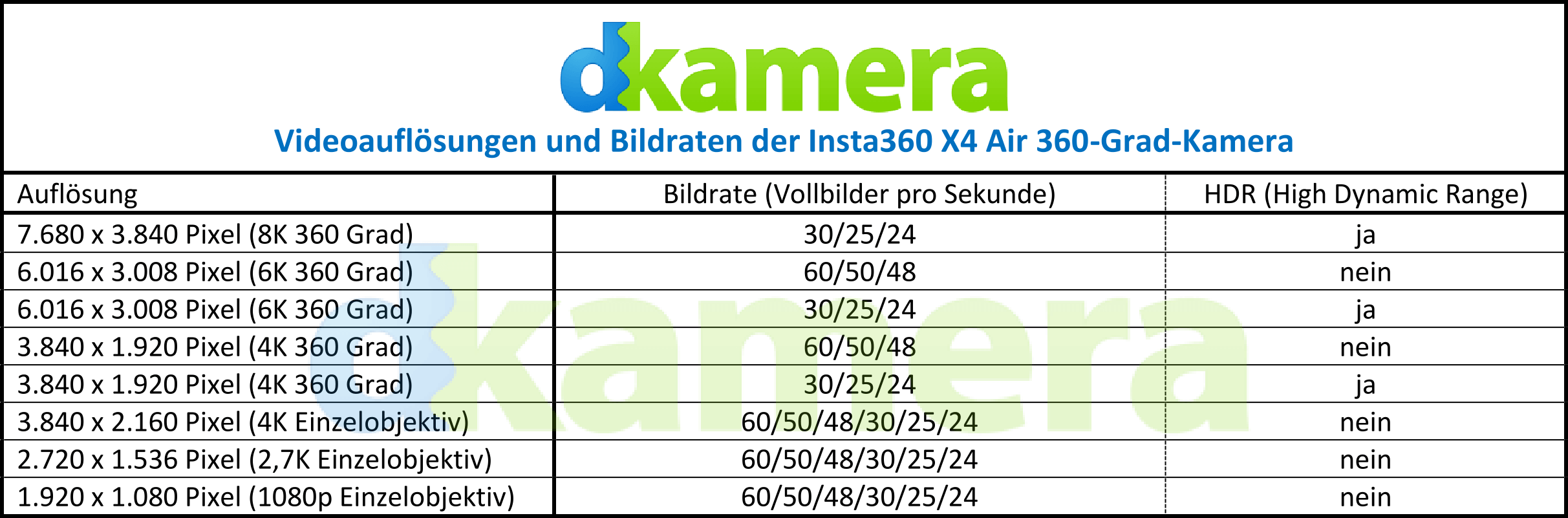 Fotos nimmt die Insta360 X4 Air mit bis zu 29 Megapixel (7.680 x 3.840 Pixel) im JPEG- sowie RAW-Format auf, Videos lassen sich mit unterschiedlichen Auflösungen und Bildraten aufzeichnen. In 8K (7.680 x 3.840 Pixel) sind bis zu 30 Vollbilder pro Sekunde, in 6K (6.016 x 3.008 Pixel) bis zu 50 Vollbilder pro Sekunde und in 4K (3.840 x 1.920 Pixel) ebenfalls bis zu 50 Vollbilder pro Sekunde möglich.