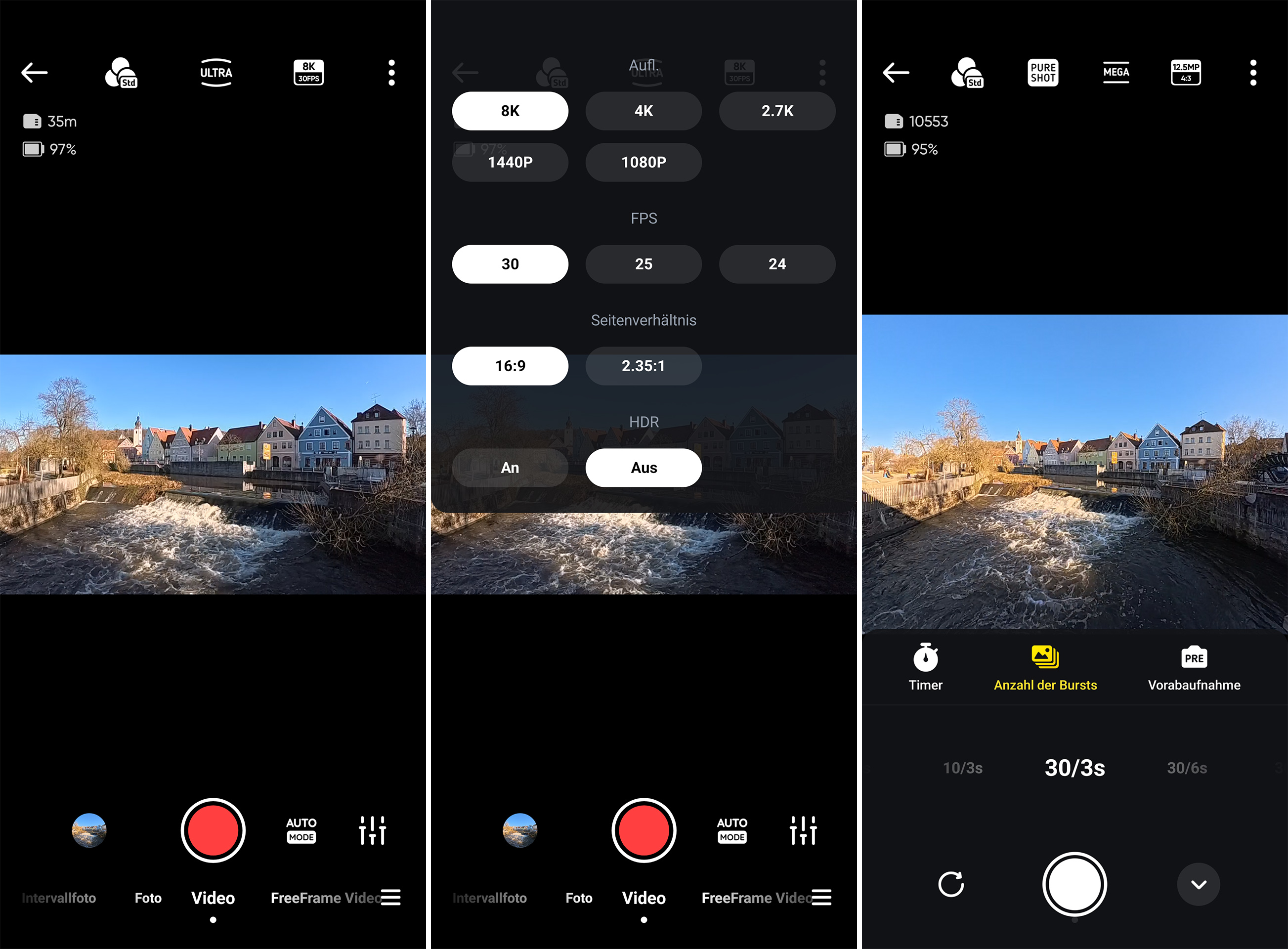 Grundsätzlich fallen die Apps ähnlich aus. Zur Bildkontrolle gibt es ein großes Livebild, die gewählten Einstellungen werden an den Rändern angezeigt. Zudem finden sich hier eine Reihe von Touchtasten, über die Eingaben vorgenommen werden können. An Optionen fehlt es bei keiner der drei Apps, alle relevanten Parameter lassen sich anpassen.
