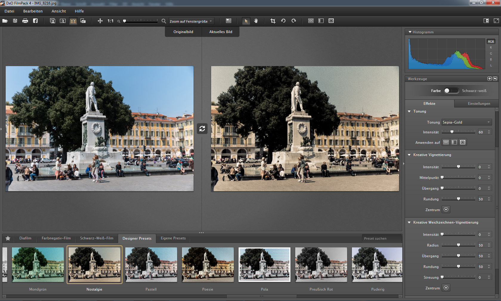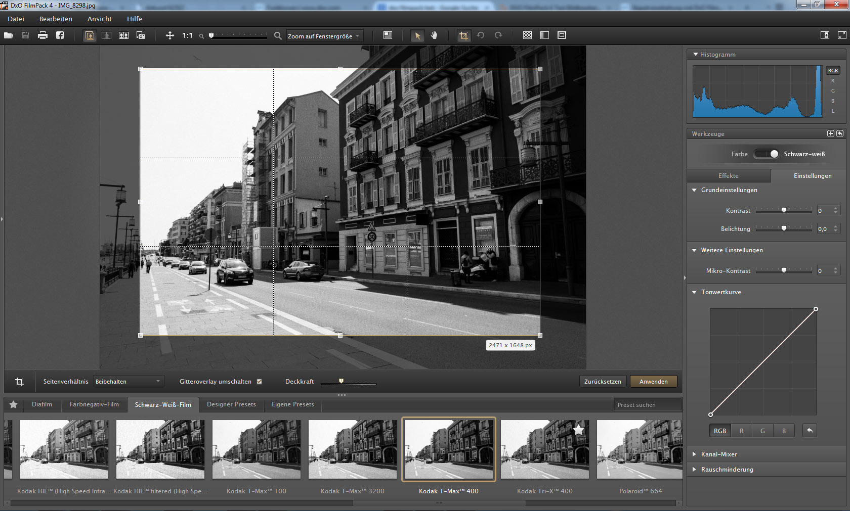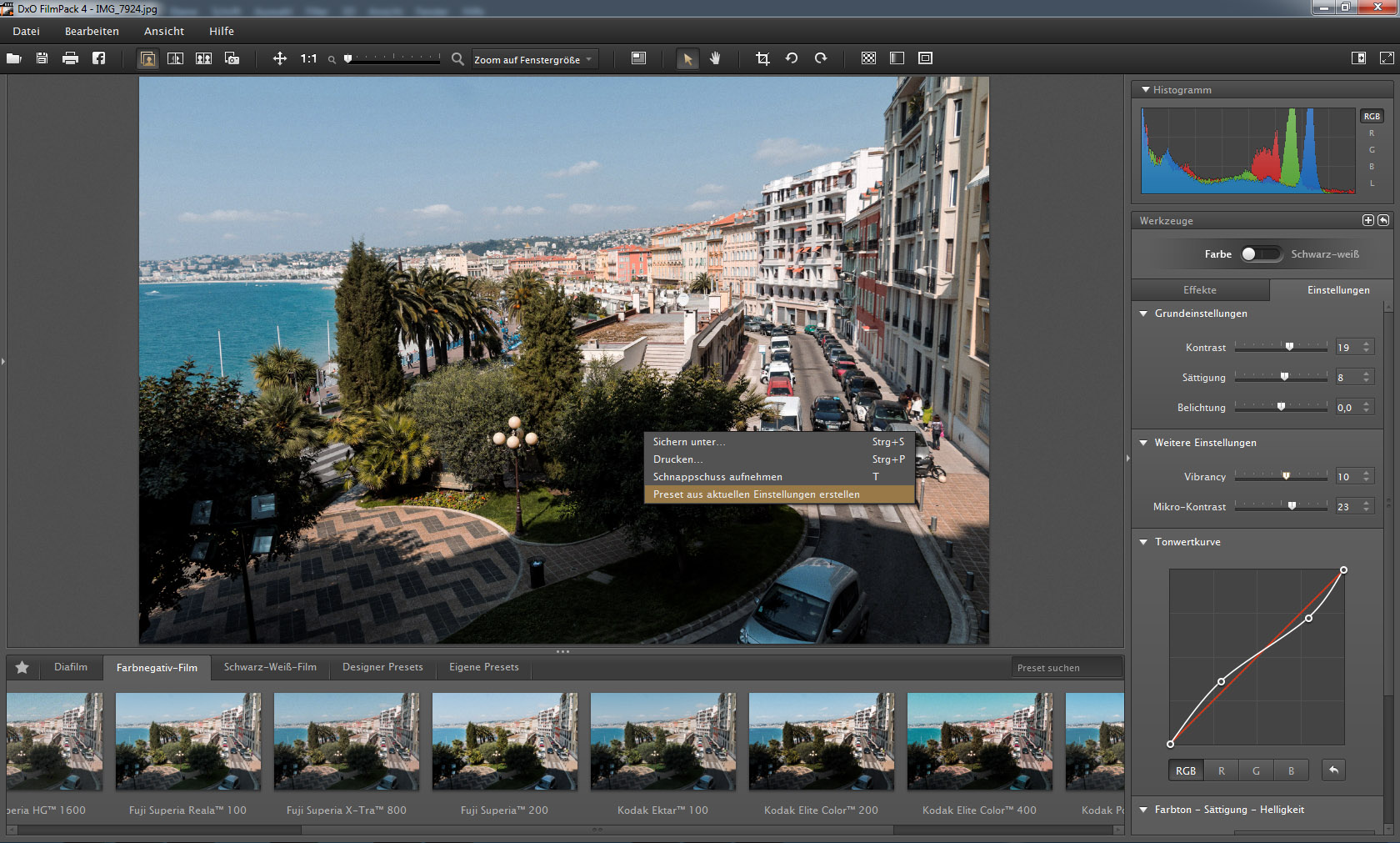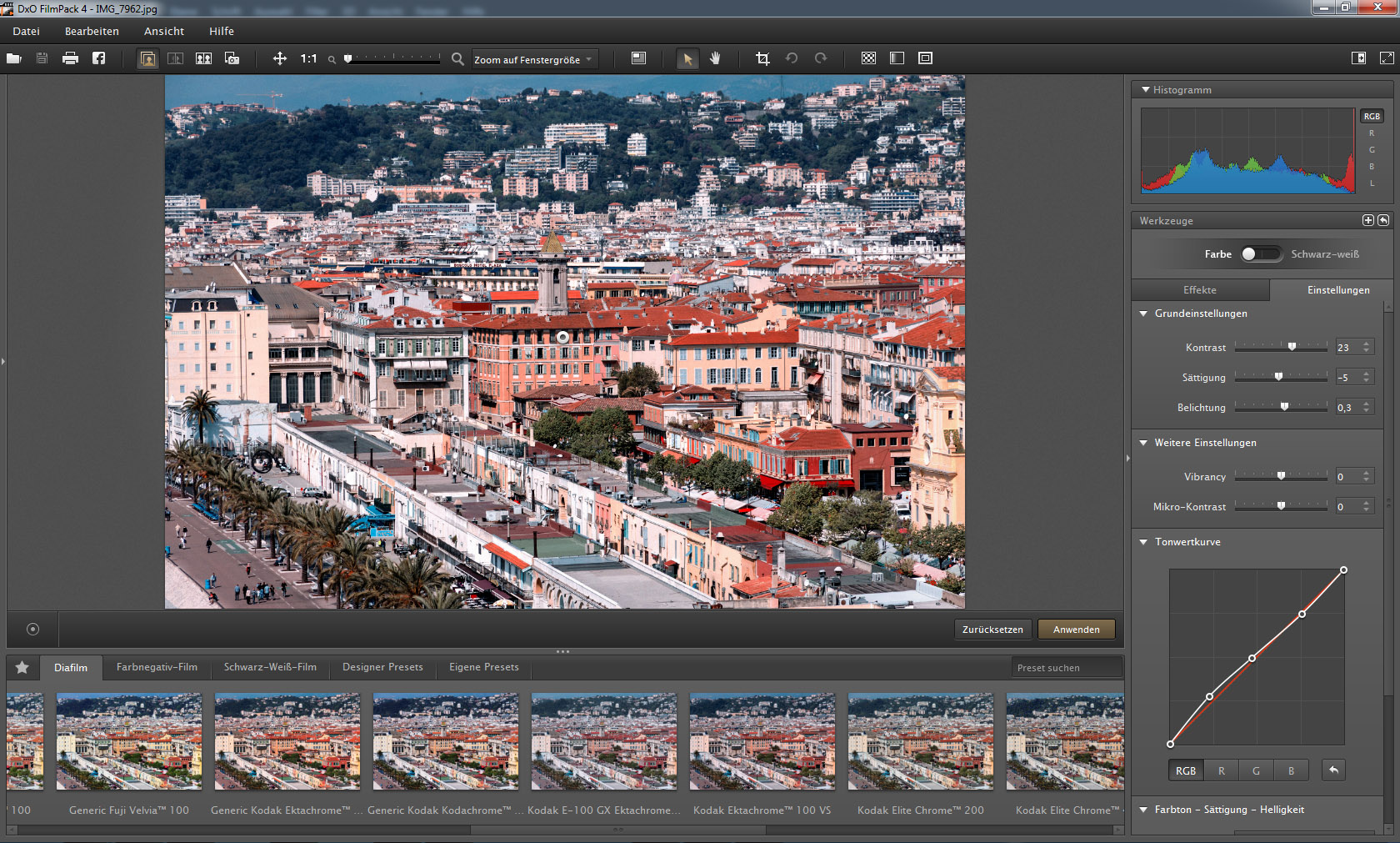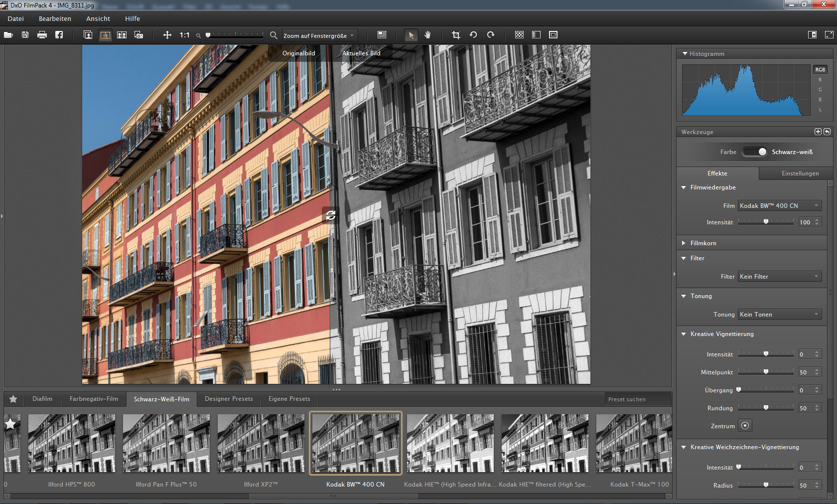 Die Arbeitsoberfläche des DxO FilmPack 4: