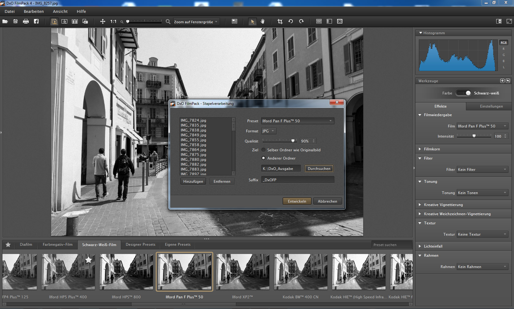 Bei der Ausgabe der fertig bearbeiteten Bilder kann man sich für das JPEG oder das Tiff-Format entscheiden, zudem lässt sich auch direkt aus dem Programm heraus drucken. Bei der Expert Edition ist außerdem auch die Ausgabe mittels einer Stapelverarbeitung möglich. Wer viele Bilder mit dem identischen „Filmlook“ ausgeben möchte, wird dies zu schätzen wissen.