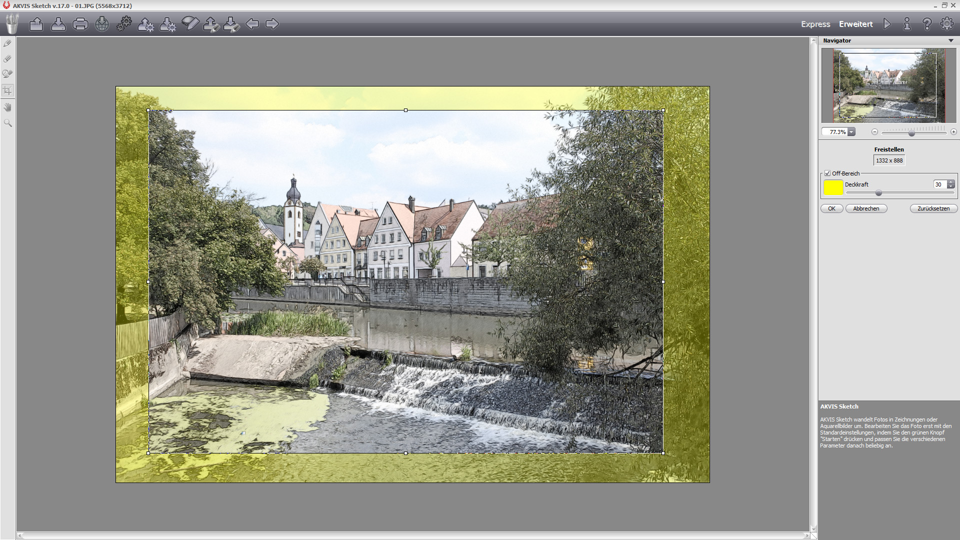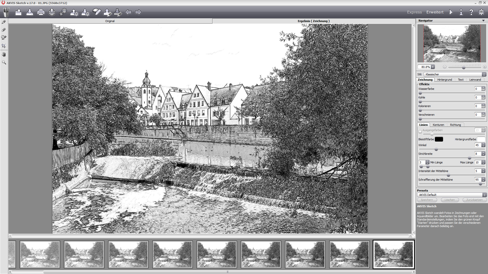 Die meisten Einstellungen befinden sich bei Franzis Sketch 17.0 in der rechten Werkzeugleiste. Hier befindet sich ganz oben der sogenannte Navigator. Dieser erlaubt die Wahl des Bildausschnittes. Darunter kann man sich für den Bearbeitungsstil entscheiden: Entweder klassisch oder künstlerisch. Ist diese Wahl getroffen, sollte man sich zunächst für ein Preset entscheiden. Diese Auswahl befindet sich am Ende der Werkzeugleiste. Da alle weiteren Optionen dazwischen liegen, hätte die Auswahl des Presets unserer Meinung nach unterhalb der Wahl des Stils mehr Sinn ergeben. Wirklich kritisch sehen wir diese Positionierung jedoch auch nicht. Generell findet man sich bei der Arbeitsoberfläche von Franzis Sketch 17.0 schnell zurecht.