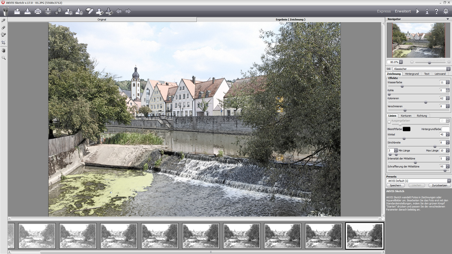 Unter dem eigentlichen Bild stehen verschiedene Zwischenstufen des angewendeten Effekts zur Verfügung. Auch darüber ist es daher möglich, die Ausprägung des Effekts an seine eigenen Wünsche anzupassen.