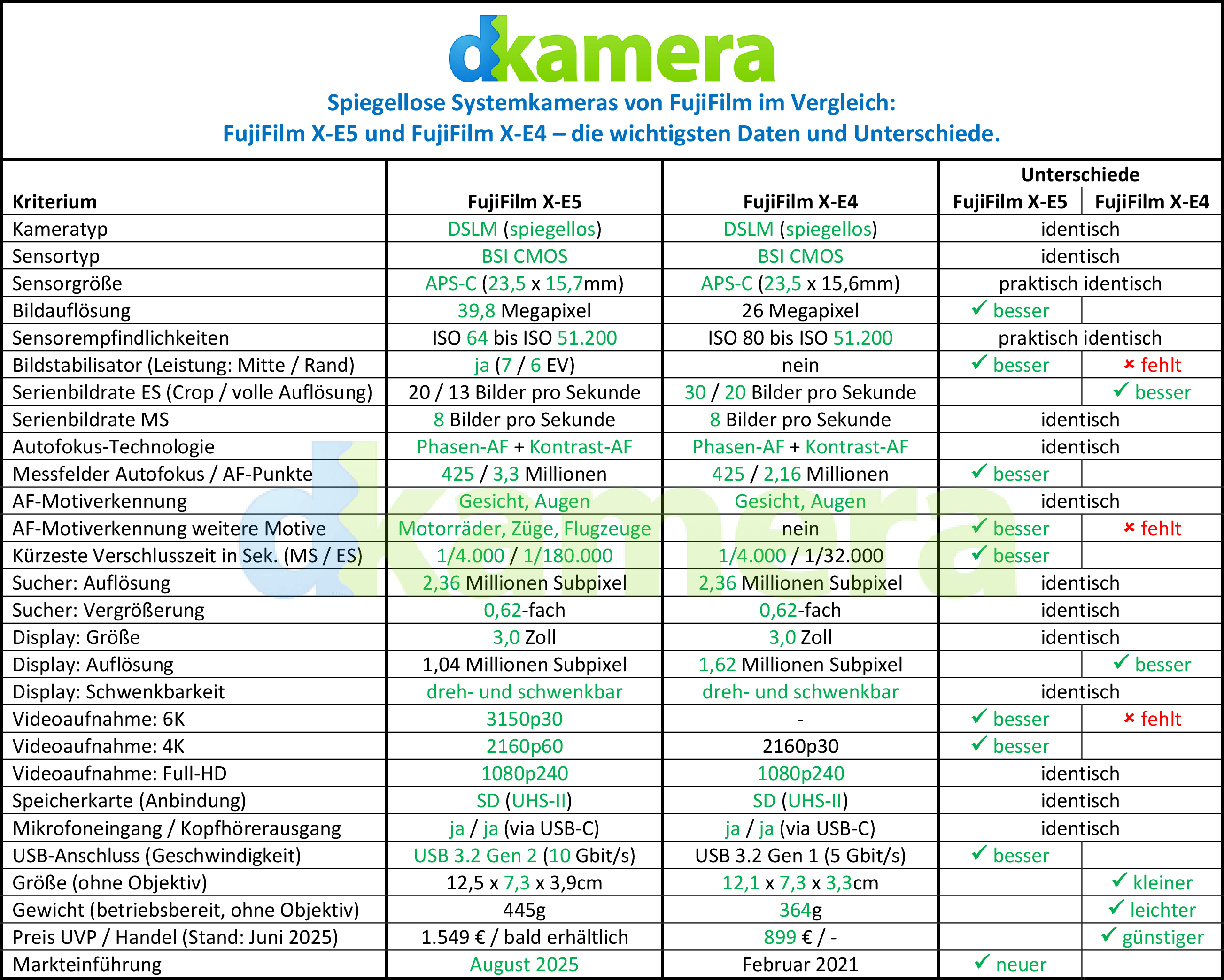 FujiFilm hat mit der X-E5 das Nachfolgemodell der schon länger erwarteten X-E4 vorgestellt. Diese kam vor mehr als vier Jahren auf den Markt. Bei der neuen Kamera wurde der Preis deutlich angehoben, die Leistungsdaten der DSLM sind jedoch teilweise auch wesentlich besser. Wir gehen im folgenden Vergleich detailliert auf die Unterschiede der beiden spiegellosen Systemkameras ein.