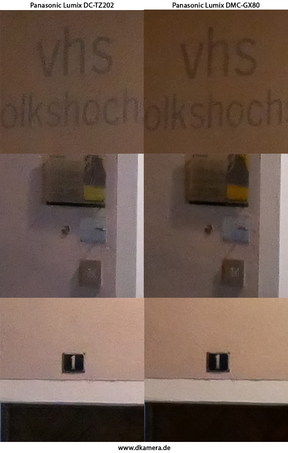 Die höhere Auflösung der Bilder der TZ202 wirkt sich beim direkten Vergleich in einer leicht besseren Detailwiedergabe aus, allzu groß sind die Unterschiede aber nicht. Dies gilt für das Fotografieren bei Tageslicht und niedrigen Sensorempfindlichkeiten. Die TZ202 scheint allerdings auch etwas stärker nachzuschärfen, wodurch die Aufnahmen teilweise etwas „knackiger“ wirken.