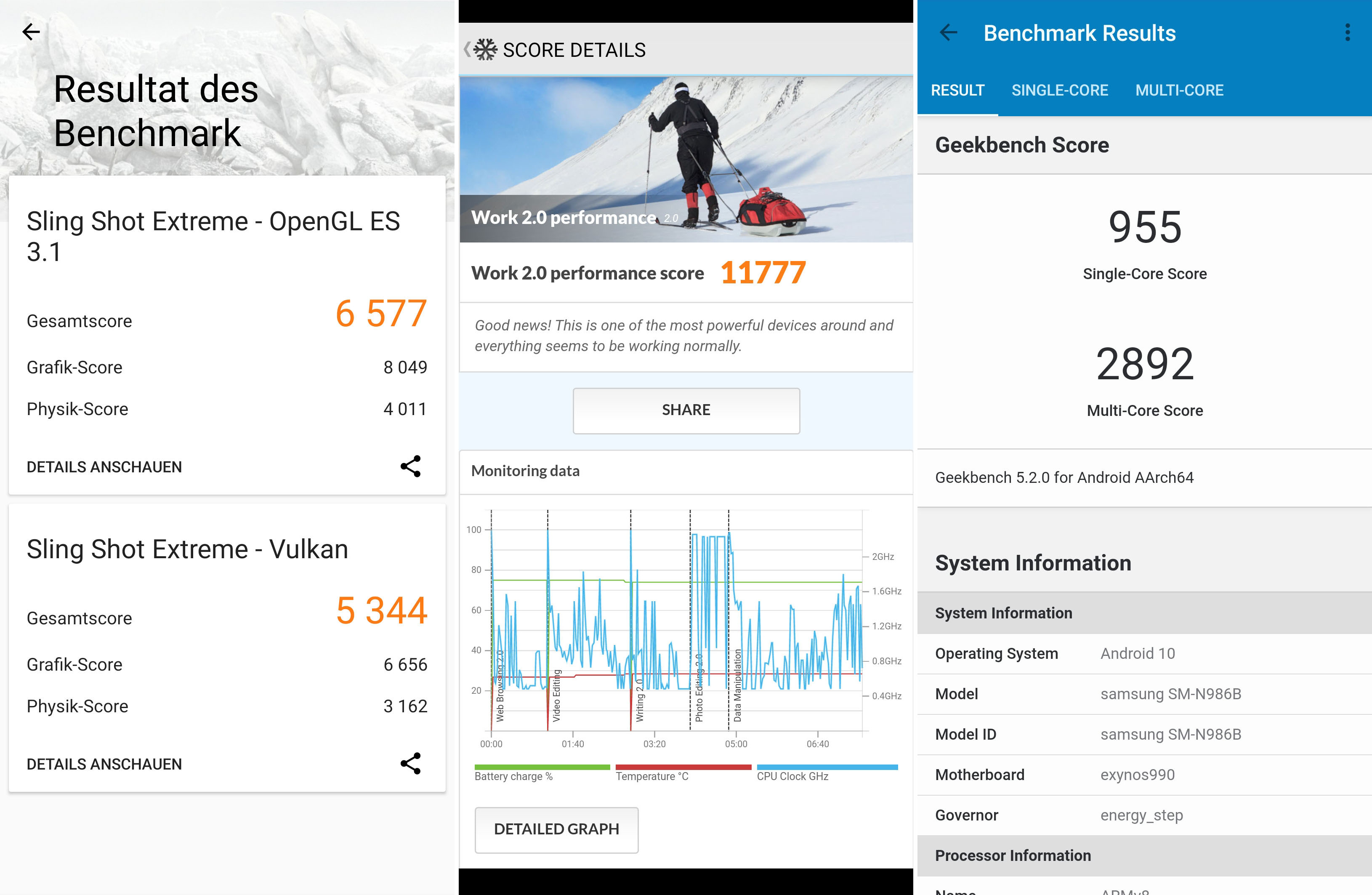 Das Galaxy Note 20 Ultra hat als Smartphone-Flaggschiff eine sehr gute Hardware zu bieten. Der Exynos 990, die Mali-G77 MP11-GPU und der 12GB große Arbeitsspeicher stellen auch bei anspruchsvollen Aufgaben ausreichend Leistung zur Verfügung. Im CPU-Benchmark Geekbench hat das Smartphone nach unseren Messungen Werte von 955 (Single Core) bzw. 2.892 Punkte (Multi-Core) erreicht, beim PC Mark (Work 2.0 Performance) waren es 11.777 Punkte. Damit gehört das Note 20 Ultra zu den besten Modellen. Beim Grafiktest 3D Mark Sling Shot Extreme ergaben sich 6.577 Punkte.