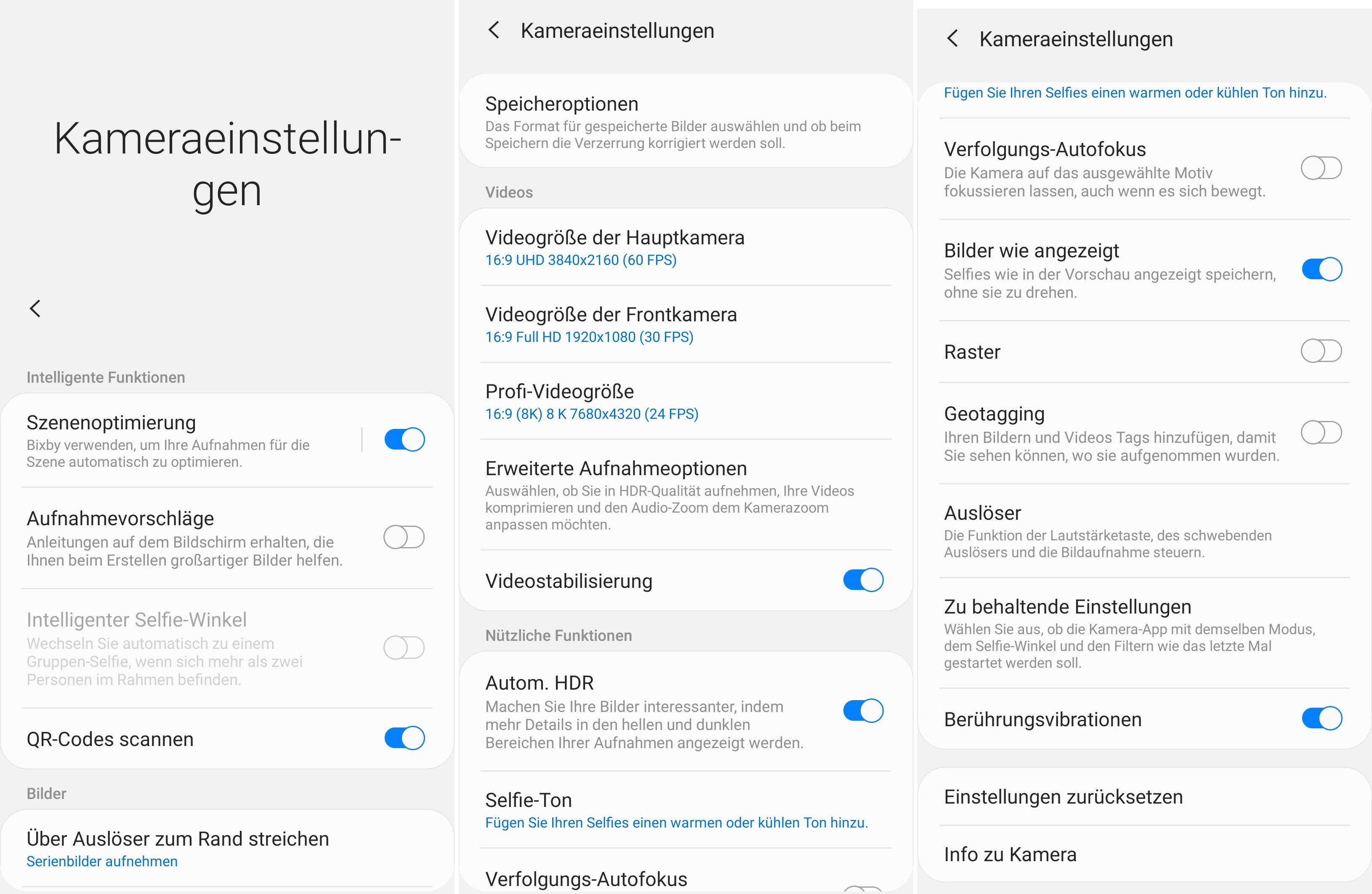 Videoaufnahmen unterstützt das Smartphone im bereits erwähnten Videomodus, zusätzlich hat Samsung einen Profi-Video-Modus, einen Live-Fokus-Videomodus, einen Zeitlupen-Modus, einen Super-Slow-Mo-Modus und einen Hyperlapsemodus integriert. Videografen können sich also austoben, an Optionen mangelt es zweifellos nicht. Auch hier gilt allerdings: Die meisten Features sind auf die Hauptkamera beschränkt.