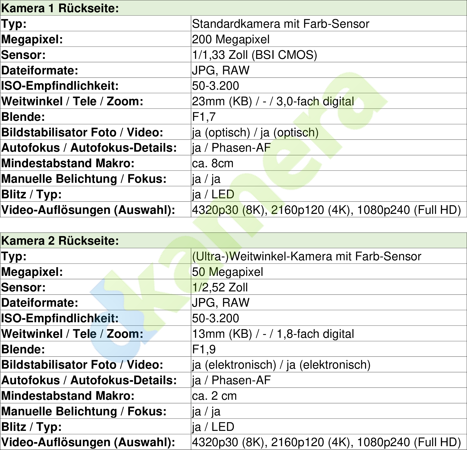Bei der 3-fach-Telekamera handelt es sich um ein Modell mit 69mm KB-Brennweite und einer Lichtstärke von F2,4. Der Sensor löst mit zehn Megapixel vergleichsweise gering auf, zudem ist er auch am kleinsten (1/3,52-Zoll-Klasse). Die Brennweite der 5-fach-Telekamera liegt bei 115mm (KB), die Lichtstärke fällt mit F3,4 etwas geringer als bei der 3-fach-Telekamera aus. Dafür nutzt Samsung einen wesentlich größeren Chip (1/2,52 Zoll) mit fünf Mal höherer Auflösung. Damit sich derartige Daten realisieren lassen, setzt Samsung auf eine Festbrennweite mit Periskopbauweise. Von der Bildstabilisierung gibt es keine Unterschiede zu berichten, diese erfolgt bei beiden Teleobjektiven optisch. Die Auflösung der Frontkamera bleibt bei den bekannten zwölf Megapixel, das 26mm-Objektiv (KB) verfügt über eine Lichtstärke von F2,2.