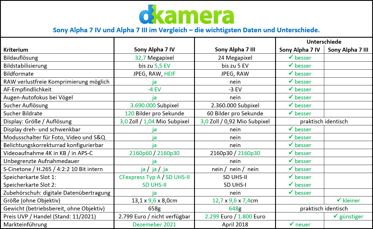 Die Sony Alpha 7 IV ist das neue Basis-Modell der Alpha-7-Serie. Hinsichtlich der technischen Daten und des Preises der Kamera passt diese Bezeichnung aber doch nicht mehr ganz. Das galt teilweise auch schon für das Vorgängermodell der Alpha 7 IV, die Alpha 7 III. Im folgenden Vergleich gehen wir auf die technischen Daten der beiden DSLMs ein und legen dar, inwieweit Sony seine neue Kamera überarbeitet hat.