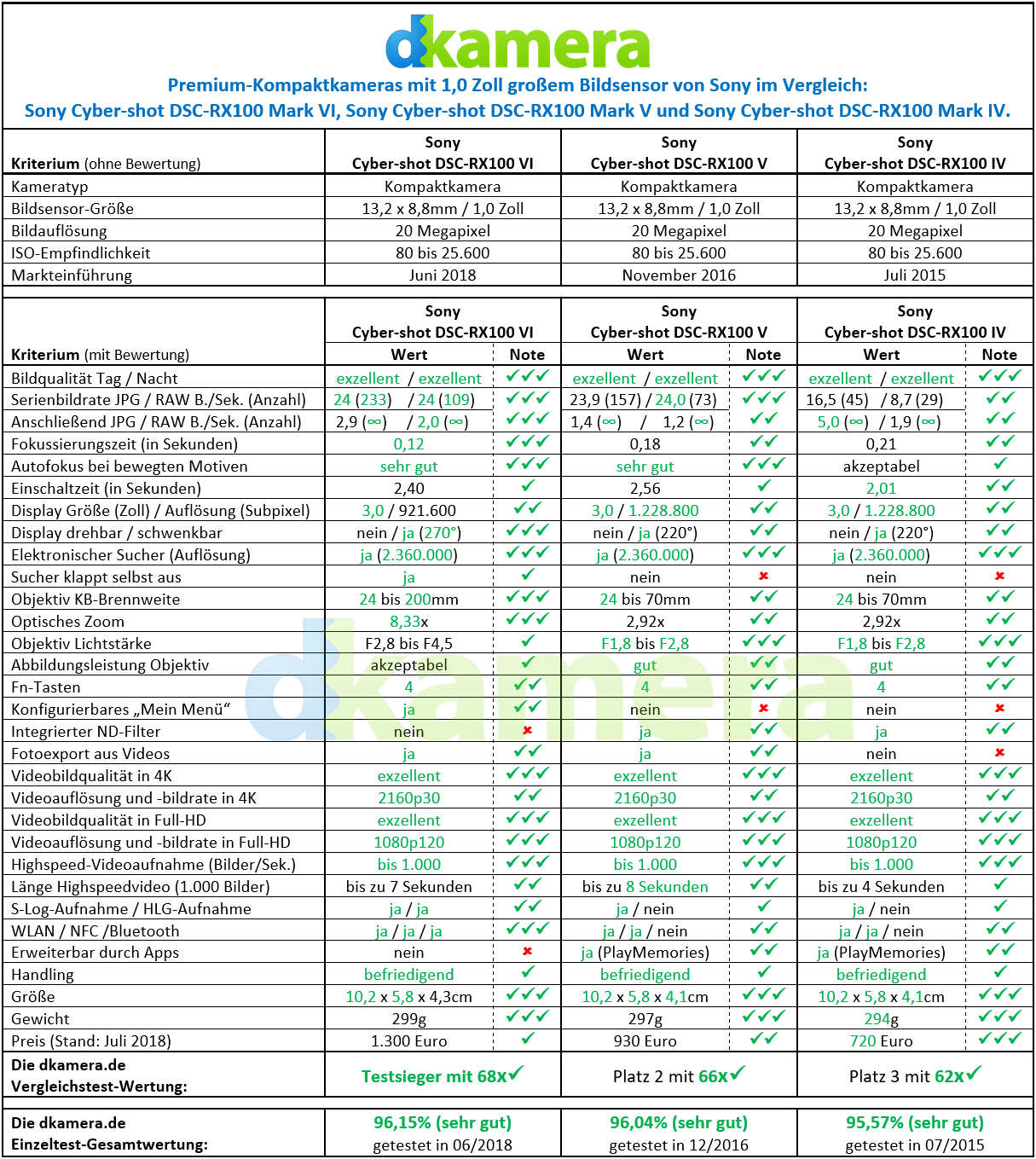 Mit der sechsten Generation seiner RX100-Kameras hat sich Sony vom üblichen Schema der Verbesserungen verabschiedet. Anstatt die „inneren Werte“ der RX100-Kameras zu verbessern, setzt Sony bei der RX100 VI auf ein neues Objektiv mit deutlich größerem Brennweitenbereich. Die RX100 VI ist das erste RX100-Modell mit Superzoom und hebt sich damit von den „Vorgängermodellen“ ab. Wie die Kamera im Vergleich zu diesen, also zur RX100 IV und RX100V, abschneidet, prüfen wir in folgendem Vergleichstest.