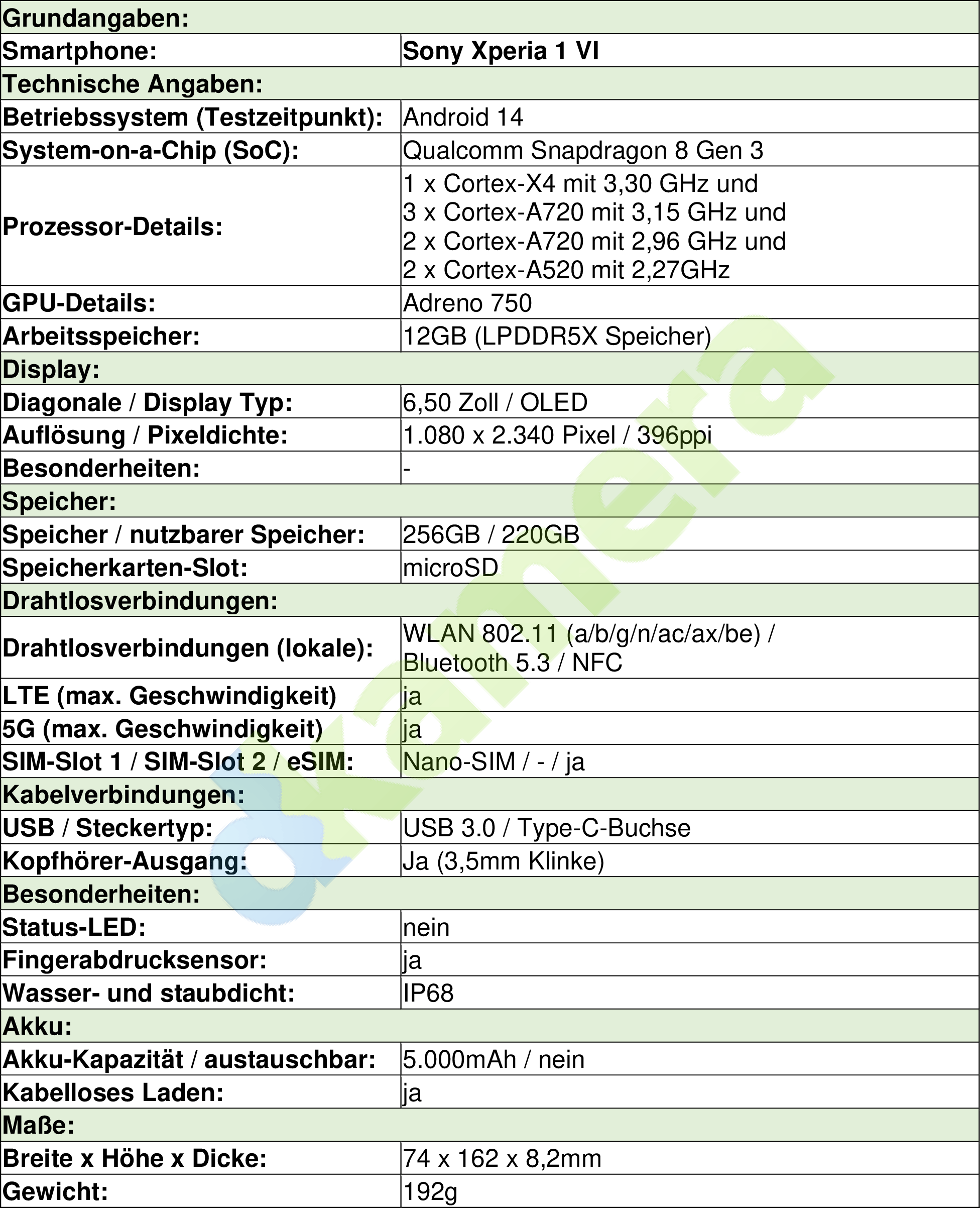 Treu bleibt sich Sony bei der Wahl des SoC und verbaut den schnellsten aktuellen Qualcomm-Chip in Form des Snapdragon 8 Gen 3 mit acht Kernen (1 × Cortex-X4 mit 3,30 GHz, 3 × Cortex-A720 mit 3,15 GHz, 2 × Cortex-A720 mit 2,96 GHz und 2 × Cortex-A520 mit 2,27 GH) sowie der Adreno 750 GPU. Den Rechenwerken stehen 12GB LP-DDR5X-RAM zur Seite, der Speicher ist 256GB groß. Anders als bei praktisch allen Flaggschiff-Geräten am Markt lässt sich der Speicher zudem mittels einer microSD-Karte erweitern. Bis zu 1,5TB fassende Modelle können Besitzer des Smartphones einsetzen, das relativiert die hohe UVP des Gerätes von 1.399 Euro für „nur“ 256GB doch ein wenig. Mit an Bord ist beim Sony Xperia 1 VI zudem wieder ein 3,5mm-Klinkenanschluss für Kopfhörer. Wer kein drahtloses Modell nutzen möchte, kann beim Xperia 1 VI also auf einen USB-C-Adapter verzichten. Apropos USB: Der Port unterstützt den 3.2 Gen 1x1-Standard und erlaubt das Aufladen des Akkus mit bis zu 30 Watt. Drahtlos kommt man auf die Hälfte davon. Das 162 x 74 x 8,2mm große Gehäuse bringt 192g auf die Waage und widersteht Staub und Wasser (IP68), Android 14 ist als Betriebssystem vorinstalliert. Die Update-Garantie liegt bei drei (Feature-Updates) bzw. vier Jahren (Sicherheits-Updates).