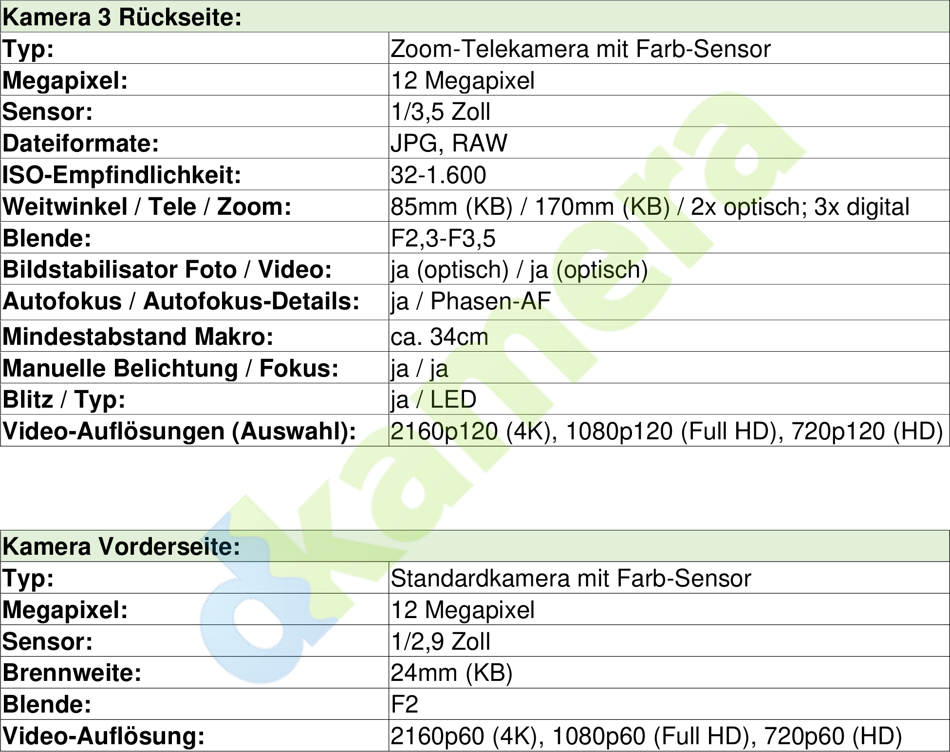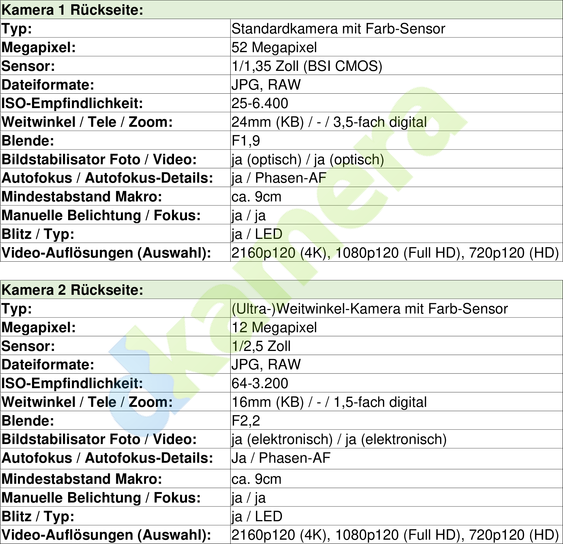 Deutlich größer und höher aufgelöst ist der Chip der Hauptkamera. Hier nutzt Sony einen Exmor T Chip im 1/1,35-Zoll-Format mit 52 Megapixel, zur Bildaufnahme werden allerdings nur 48 Megapixel verwendet. Bilder lassen sich mit 12 Megapixel sowie mit voller Auflösung ausgeben, zudem gibt es einen verlustarmen 2-fach-Zoom. Das Objektiv der Hauptkamera besitzt eine kleinbildäquivalente Brennweite von 24mm, ist stabilisiert und verfügt über eine Blendenöffnung von F1,9.