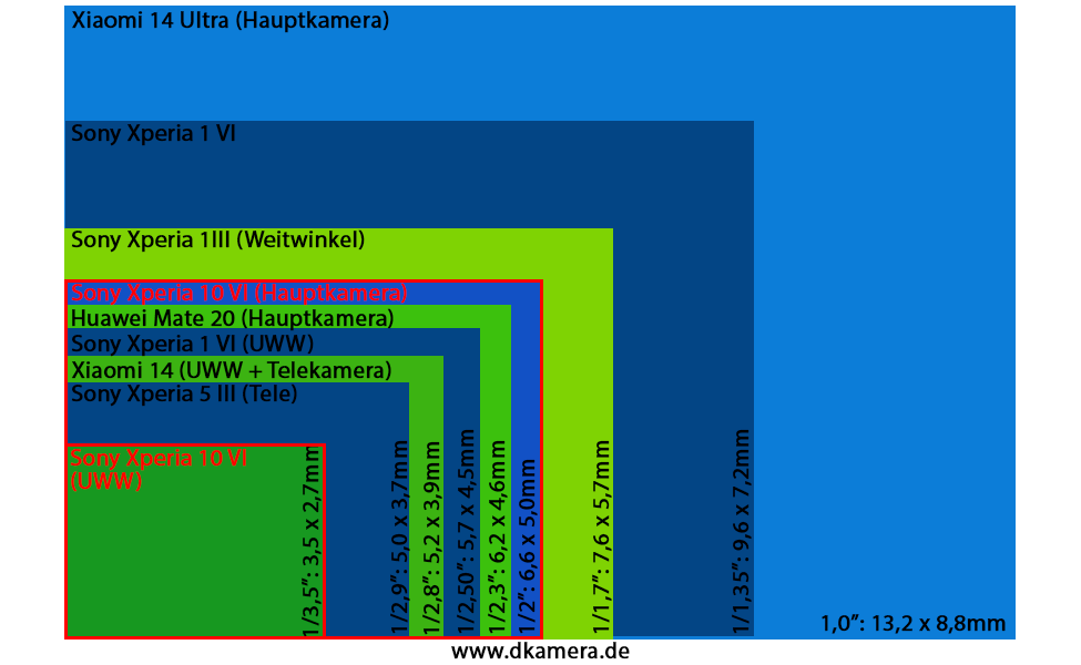 Für die Hauptkamera mit optisch stabilisierter Weitwinkelbrennweite gibt Sony 26mm (KB-äquivalent) an, die Lichtstärke ist mit F1,8 etwas höher. Hier nutzt Sony zudem einen Exmor RS-Bildwandler der 1/2-Zoll-Klasse. Dessen Fläche fällt im Vergleich zum Ultraweitwinkelchip rund dreimal größer aus, die Auflösung ist mit 48 Megapixel allerdings auch achtmal höher. Die volle Pixelzahl bekommen Nutzer jedoch nicht zu Gesicht, durch Pixel-Binning beträgt die Auflösung der Fotos stets 12 Megapixel.