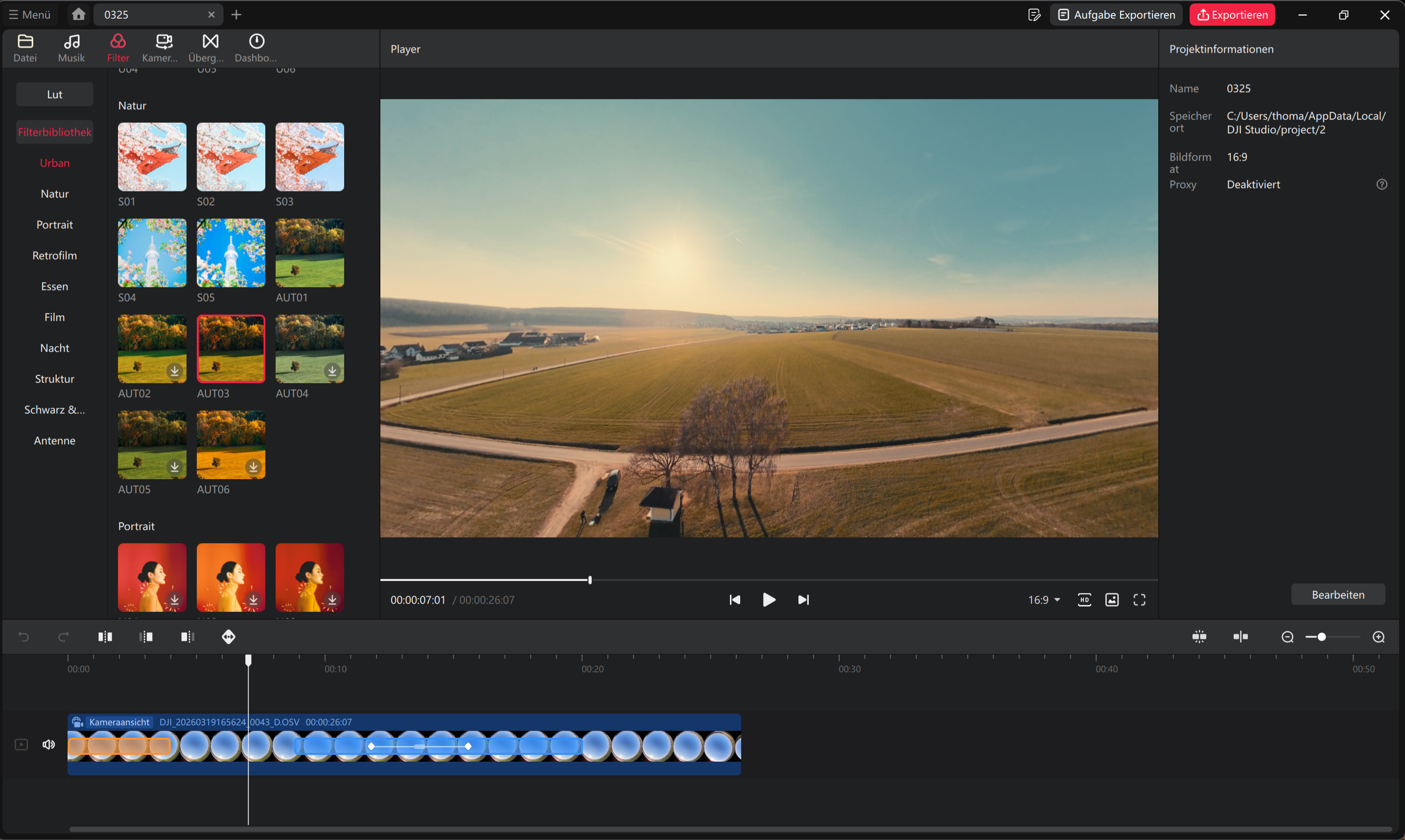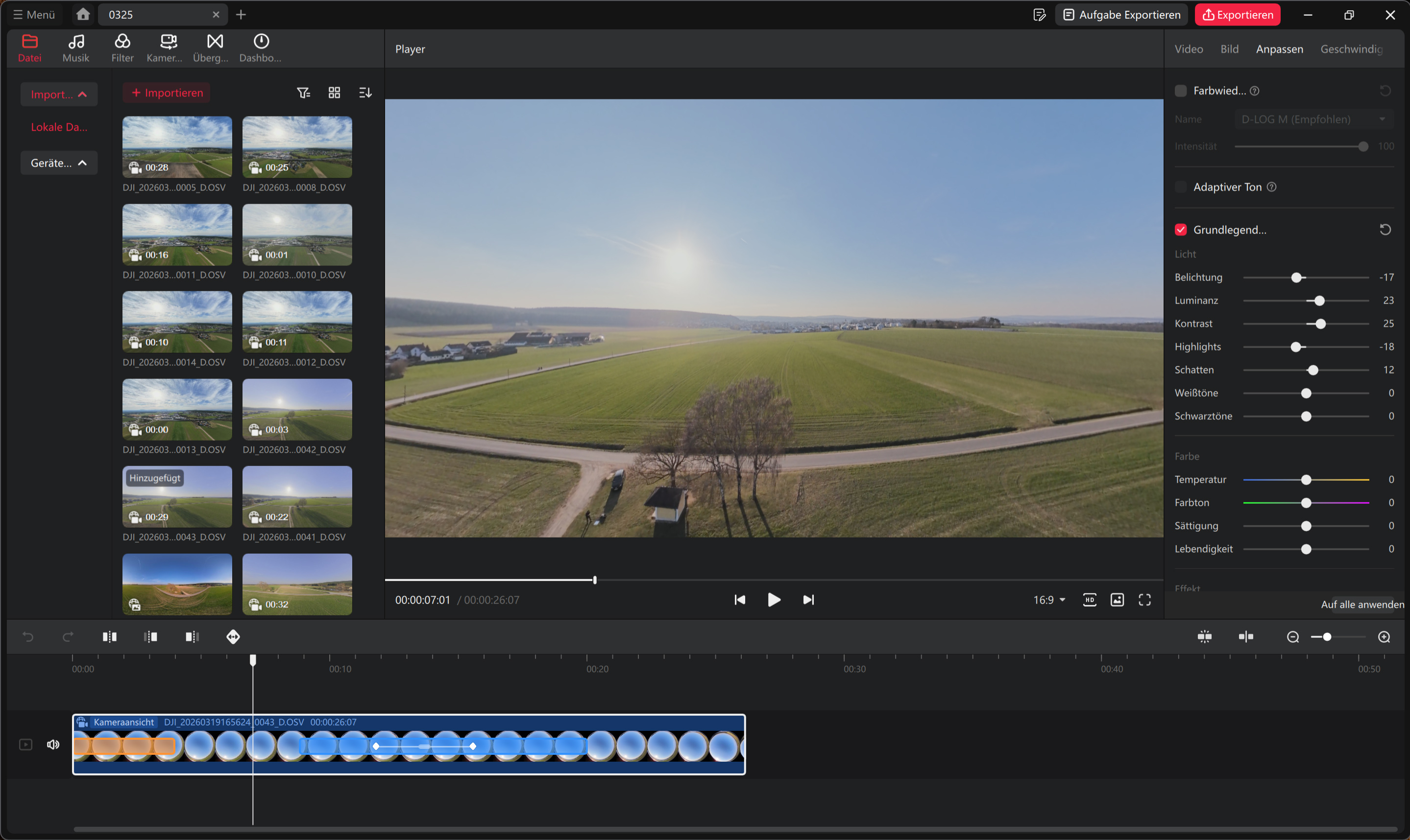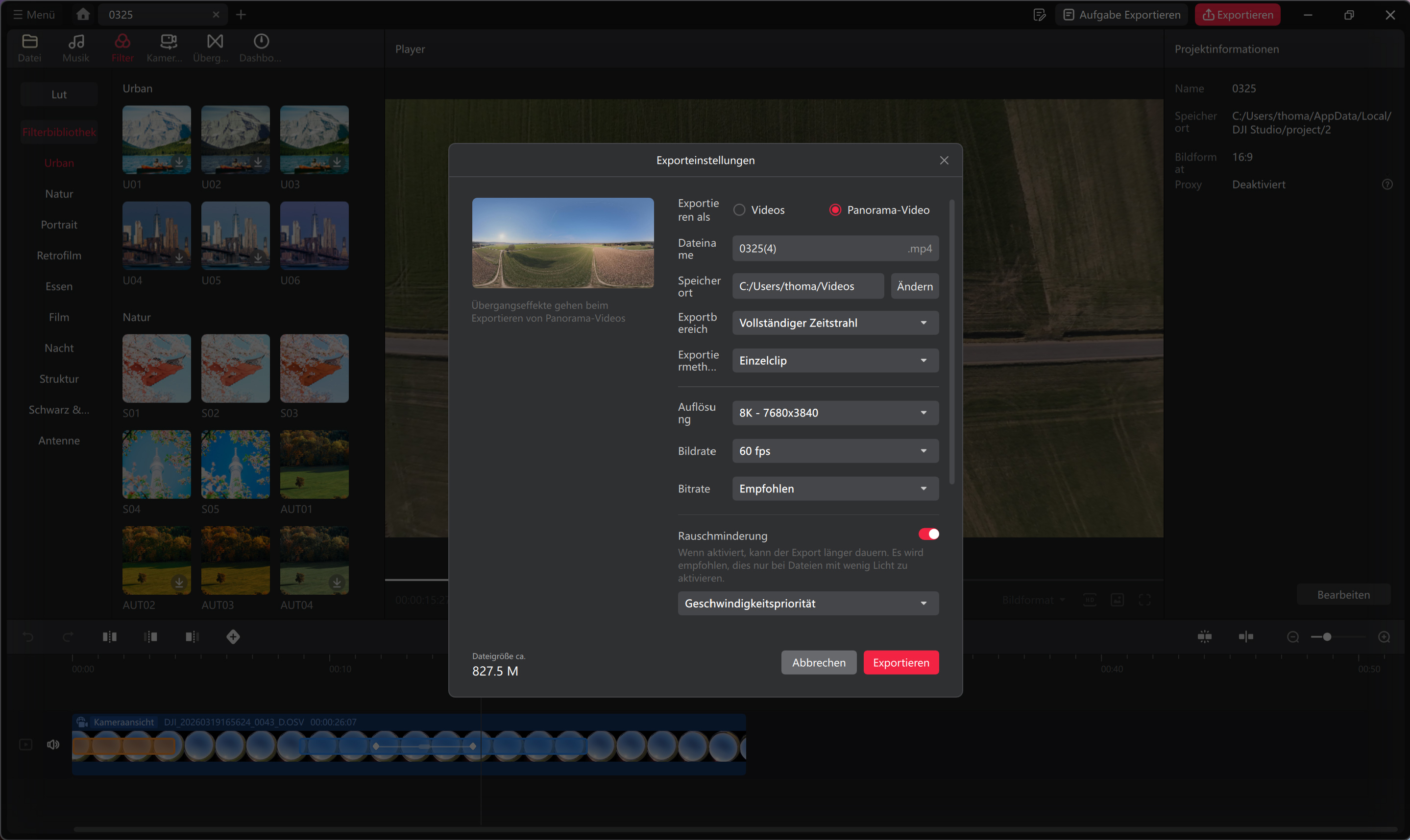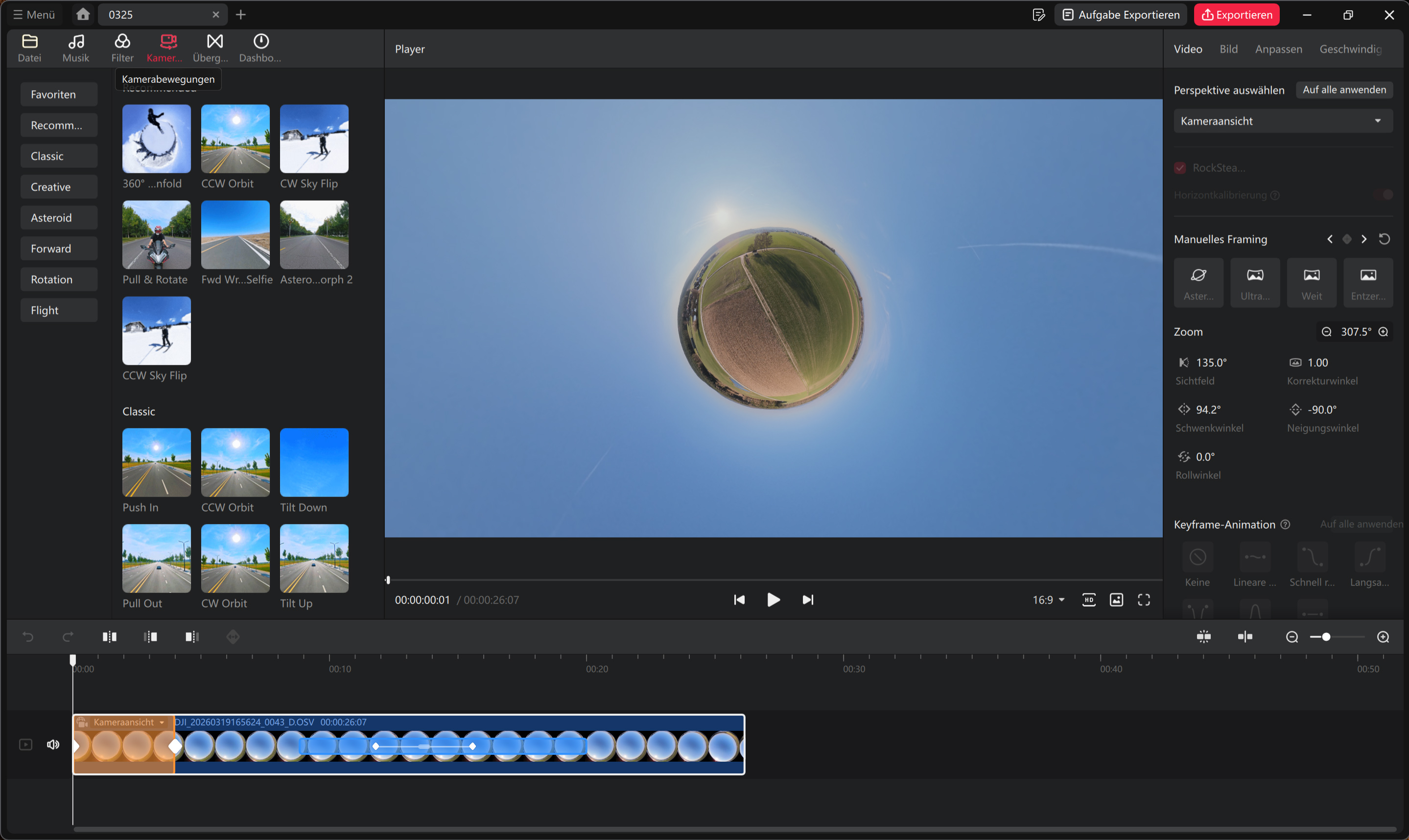 Wer mit der DJI Avata 360 360-Grad-Videos aufzeichnet, hat bei der Nachbearbeitung mehr Möglichkeiten als bei klassischen Videos. Diese Vorteile gehen allerdings auch mit Nachteilen einher. 360-Grad-Aufnahmen müssen immer bearbeitet werden, ansonsten sind sie wenig bis nicht brauchbar. Dafür bietet DJI die hauseigene Software DJI Studio an. Diese erlaubt das Festlegen des Bildausschnittes, das Hinzufügen vorgefertigter Effekte oder auch die von klassischen Bildbearbeitungsprogrammen bekannten Korrekturen (Helligkeit, Kontrast, Sättigung, Schärfe, …). Zielgruppe der Software sind vor allem Einsteiger, diesen stehen eigentlich alle notwendigen Bearbeitungsfunktionen zur Verfügung.