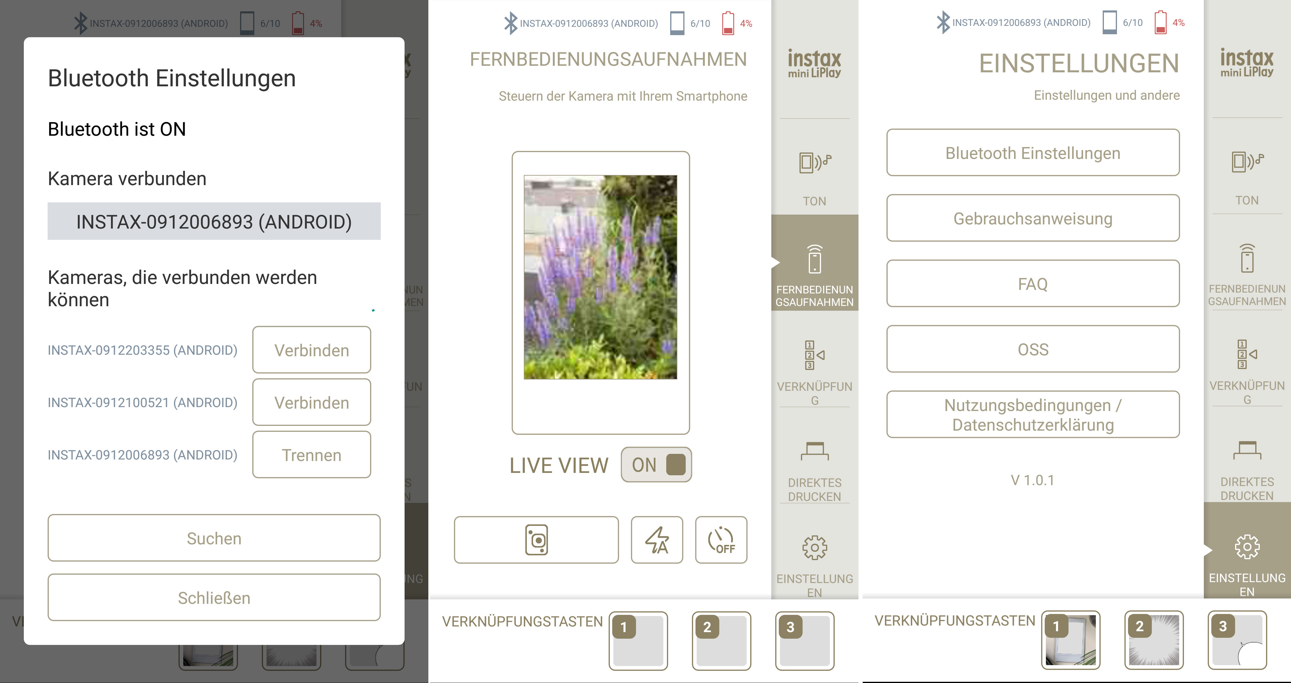 Wer das Livebild der Kamera ansehen möchte, entscheidet sich für den Reiter „Fernbedienungsaufnahmen“. Die App erlaubt in diesem Modus das Auslösen, das Konfigurieren des Blitzes und des Selbstauslösers. Die Live-Ansicht lässt allerdings zu wünschen übrig, sie ist klein und sehr pixelig. Den Bildausschnitt – und damit das Wichtigste – kann der Fotograf immerhin kontrollieren. Daneben wird die App zum Koppeln des Mobilgeräts mit der instax mini LiPlay und zum Hochladen von Soundfiles benötigt. Soundfiles? Ja, ganz recht. Die Sofortbildkamera speichert zusätzlich zu Bildern auch Audiodateien. Dabei handelt es sich um kurze Ton-Schnipsel, die sich zu einem Bild speichern lassen. Das können Glückwünsche, kurze Informationen oder Umgebungsgeräusche sein. Die Dateien werden auf einem Server von FujiFilm abgelegt und lassen sich dort für ein Jahr abrufen. Kostenlos versteht sich. Den Ton kann der Nutzer per QR-Code abrufen, diesen druckt die Kamera auf das Bild. Das geht denkbar einfach und ist ein nettes Gimmick. Ob diese Funktion auch nach längerer Zeit noch Spaß macht, können wir allerdings nicht bewerten. Dass die Sounddateien nur ein Jahr gespeichert bleiben, sehen wir angesichts der deutlich längeren Haltbarkeit eines Bildes als wenig sinnvoll an. Eigentlich müssten es fünf oder besser zehn Jahre sein, denn auch nach so einer langen Zeit will man Bilder noch betrachten und den Ton anhören können.
