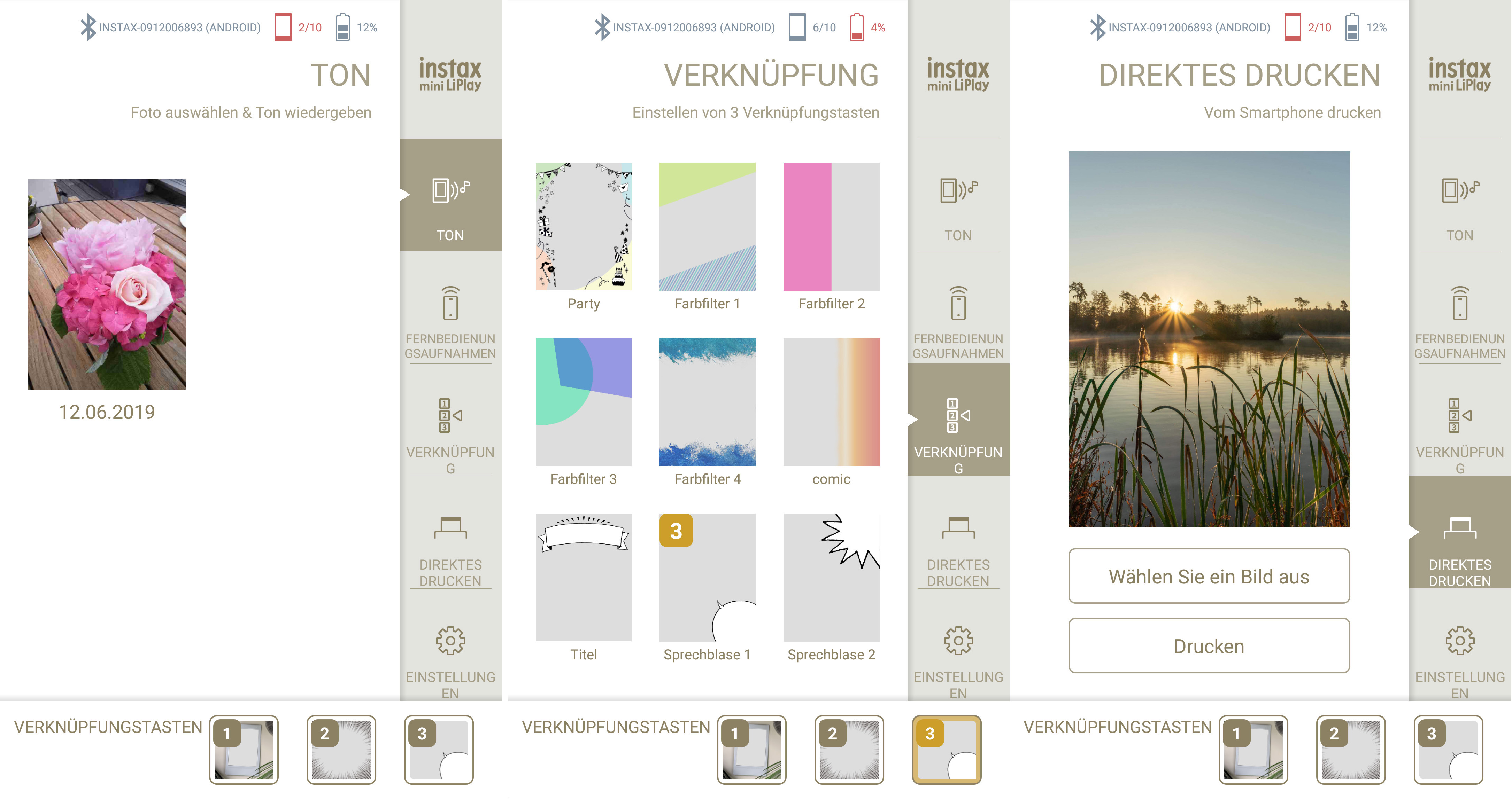 Im Gegensatz zu analogen Sofortbildkameras, die Bilder direkt nach der Aufnahme ausgegeben, bietet die FujiFilm instax mini LiPlay einige Vorteile. Es handelt sich nämlich um eine hybride Sofortbildkamera, diese speichert Fotos digital. Das erlaubt nicht nur das digitale Abspeichern eines Fotos zur späteren Weiterverwendung oder die Bildkontrolle nach der Aufnahme, die FujiFilm instax mini LiPlay druckt Fotos auch von anderen Quellen – zum Beispiel dem Smartphone. Für Letzteres wird die LiPlay-App benötigt, die sich kostenlos für iOS und Android beziehen lässt. Die App ist aber nicht nur für das Drucken zuständig, sie dient auch zur Konfiguration der Kamera und erlaubt die Livebild-Kontrolle. Konfigurieren lassen sich bei der FujiFilm instax mini LiPlay die drei Direktwahltasten an der linken Seitenfläche, darüber fügt der User unter anderem Rahmen oder andere Verzierungen zu den Bildern hinzu.