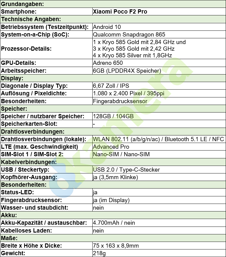 Das Xiaomi Poco F2 Pro ist ein 163 x 75 x 8,9mm großes und 219g auf die Waage bringendes Smartphone. Es verfügt über ein 6,67 Zoll messendes OLED-Display mit 2.400 x 1.080 Pixel (395ppi) und einer Wiedergabe von 60Hz. Beim SoC handelt es sich um einen Qualcomm Snapdragon 865. Dieser besitzt acht Kerne: einen Kryo Gold-Kern mit 2,84 GHz, drei Kryo Gold-Kerne mit 2,42 GHz und vier Kryo Silber-Kerne mit 1,80 GHz. Die GPU ist vom Typ Adreno 650, der Arbeitsspeicher unseres Testmodells ist 6GB (LPDDR4X) groß. Des Weiteren gibt es Modelle mit 8GB LPDDR5 RAM. Beim Festspeicher gibt es ebenfalls zwei unterschiedliche Kapazitäten, 128GB (unser Testmodell) und 256GB. Erweitern lässt sich der Speicher nicht, SIM-Karten in Nano-Größe sind zwei nutzbar.