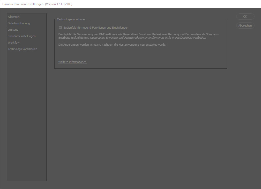 Adobe erweitert den Funktionsumfang seiner Programme in regelmäßigen Abständen. Nun wurde das „Reflection Removal“-Werkzeug vorgestellt. Dieses erlaubt ab ACR 17.1 bei RAW-Dateien das automatische Entfernen von Spiegelungen. Aktuell gehört die Funktion noch zu den Technologievorschauen, befindet sich also weiterhin in der Entwicklung.