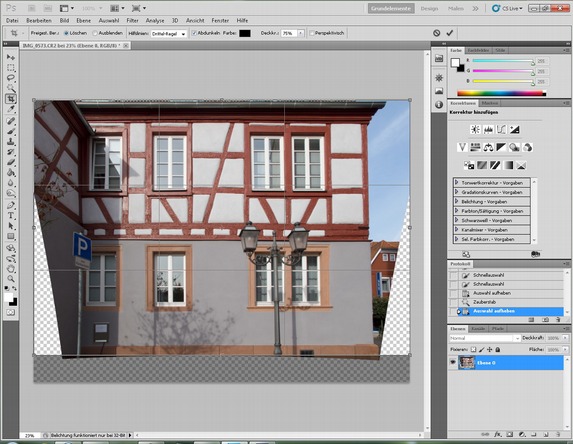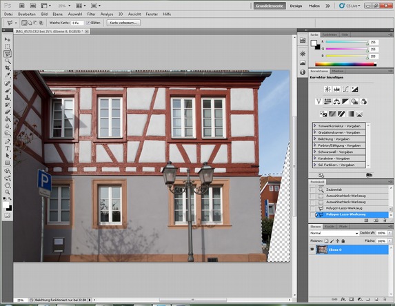 Auf der rechten Seite klappt das nicht so gut, darum markieren wir den transparenten Bereich und das rote Gebäude und benutzen das „Ausbesserungswerkzeug“ um die Auswahl mit Himmel zu füllen. Wem das zu aufwändig ist, der kann auch die rechte Seite etwas weiter abschneiden.