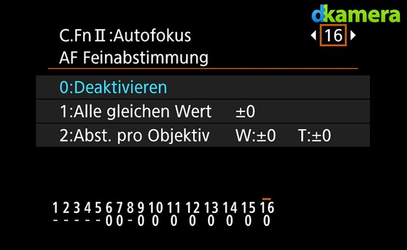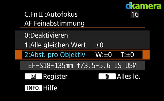 Wir erläutern die AF-Feinabstimmung am Beispiel einer Canon EOS 80D. Bei dieser wird die entsprechende Option über das C.Fn II Menü erreicht. Hier kann zwischen der Korrektur aller Objektive mit den identischen Werten oder einer vom Objektiv abhängigen Korrektur entschieden werden. Letzteres ist bis auf Ausnahmefälle die beste Wahl.