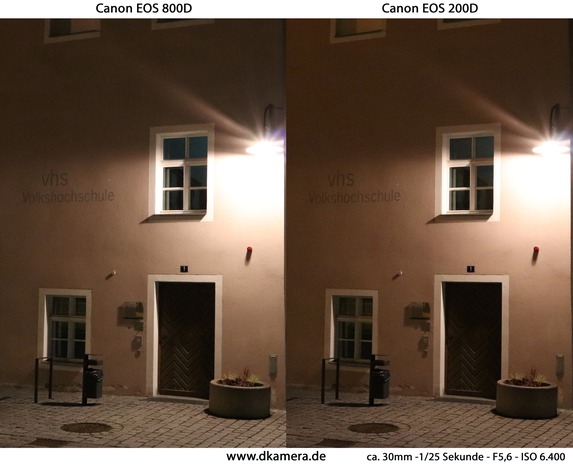 Dies zeigt auch unser Nachtvergleich: Bei Ausschnittsvergrößerungen tritt das Rauschen deutlich zum Vorschein, die Detailwiedergabe leidet sichtlich.