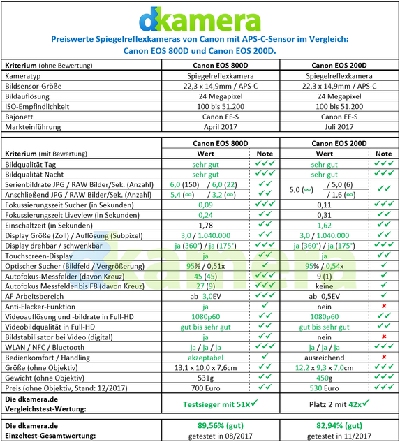 Die im Jahr 2017 vorgestellten Kameras Canon EOS 800D und EOS 200D verbindet unter anderem die Zugehörigkeit zur Spiegelreflexklasse. Bereits auf den ersten Blick sind beide Digitalkameras wegen ihrer Sucherbuckel und Handgriffe als DSLRs zu erkennen. Beim zweiten Blick fällt auf, dass die EOS 800D „erwachsener“ als die EOS 200D wirkt.