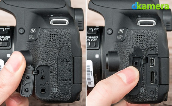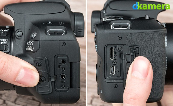Des Weiteren lassen sich über den Zubehörschuh Mikrofone montieren, deren Signal per 3,5mm-Klinkeneingang in die Kamera eingespeist wird. Zusätzlich stehen ein Mini-USB-Port und ein Mini-HDMI-Ausgang zur Verfügung. Die Fernsteuerung ist per Kabel oder per WLAN möglich, bei der EOS 800D auch per Infrarot. WLAN wird von beiden Modellen auch zur drahtlosen Datenübertragung verwendet, NFC und Bluetooth erleichtern die Verbindungsaufnahme.