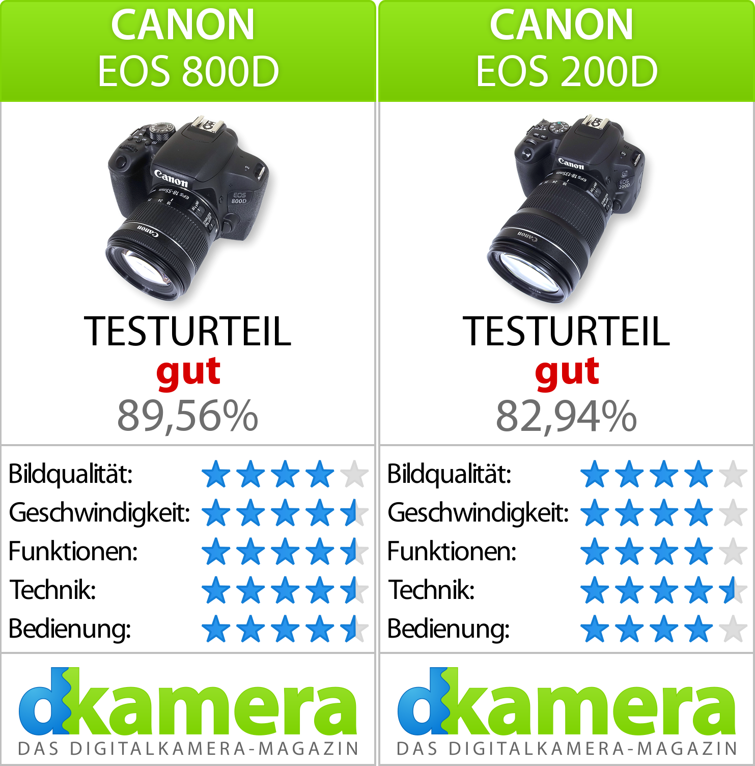 Im Test kam es daher manchmal zu ungewollten Bedieneingaben. Die Canon EOS 800D gefällt uns in puncto Bedienung daher besser. Dies gilt auch insgesamt, da es sich um die leistungsfähigere Kamera handelt. Nur wer eine möglichst kompakte Spiegelreflexkamera sucht, sollte daher den Kauf der EOS 200D erwägen.