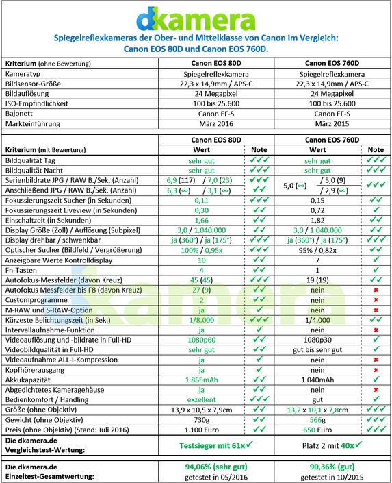 Die Modelle der "zweistelligen" und "dreistelligen" Serien von Canon wurden hinsichtlich der Features bislang immer recht stark auf Abstand gehalten. Während die dreistelligen Modelle klar an Einsteiger gerichtet waren, sind die zweistelligen Kameras mit einigen Profifeatures ausgestattet. Seit der Vorstellung der 760D hat sich dies allerdings etwas verändert. Ein paar Features, die Canon bislang nur bei höherklassigen Kameramodellen angeboten hat, sind auch bei der EOS 760D zu finden. Dies sind unter anderem das Kontrolldisplay auf der Oberseite und das zweite Einstellrad auf der Rückseite. Wir vergleichen im folgenden Test beide Spiegelreflexkameras anhand verschiedener Kriterien, um herauszufinden, wie groß der Abstand zwischen beiden Modellen ist.