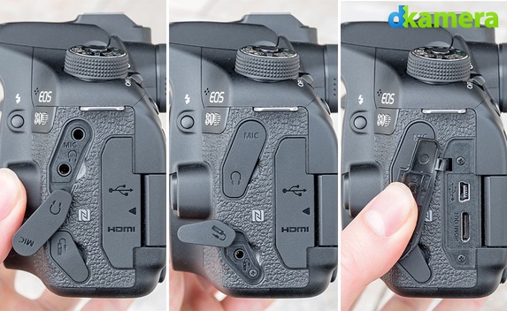 Als Schnittstellen haben beide Kameramodelle einen Mini-HDMI- und einen Mini-USB-Port zu bieten. Darüber lassen sich unter anderem externe Monitore anschließen. Des Weiteren steht jeweils ein Klinkeneingang (3,5mm) für ein externes Mikrofon zur Verfügung, und eine Kabelfernbedienung kann ebenso angeschlossen werden. Mehr zu bieten hat die 80D allerdings durch ihren Kopfhörerausgang. Über diesen ist wie erwähnt die Kontrolle des Tons direkt bei der Aufnahme möglich. Für Blitzgeräte ist jeweils der bei Spiegelreflexkameras übliche Blitzschuh vorhanden, die integrierten Blitzgeräte besitzen eine Leitzahl von zwölf bei ISO 100.