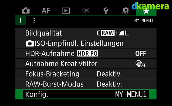 Bei den Menüs hat sich Canon für den bekannten Aufbau und das schon länger genutzte Design entschieden. Alle Optionen sind auf sechs Reiter (Untermenüs für Aufnahme-, AF-, Wiedergabe-, Kommunikations- sowie Einstellungs-Optionen und Individualfunktionen) aufgeteilt, der siebte Reiter beherbergt das My Menu. Dieses lässt sich frei zusammenstellen.