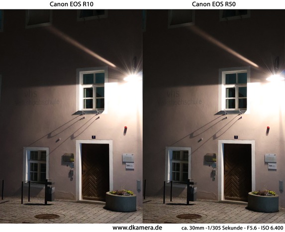 Bei unserem Nachttest haben wir uns für ISO 6.400 und damit eine sehr hohe Sensorempfindlichkeit entschieden. Diese lässt das Bildrauschen deutlich ansteigen, die vorhandene Rauschreduzierung sorgt für einen sichtbaren Detailverlust. Mit Qualitätsabstrichen lassen sich die Aufnahmen jedoch verwenden. Für Kameramodelle der Einsteiger- bis Mittelklasse kann sich die Bildqualität auf jeden Fall sehen lassen. Erst ab einem ISO-Wert von 12.800 würden wir die Fotos der DSLMs wegen der zu schlechten Bildqualität nicht mehr nutzen.