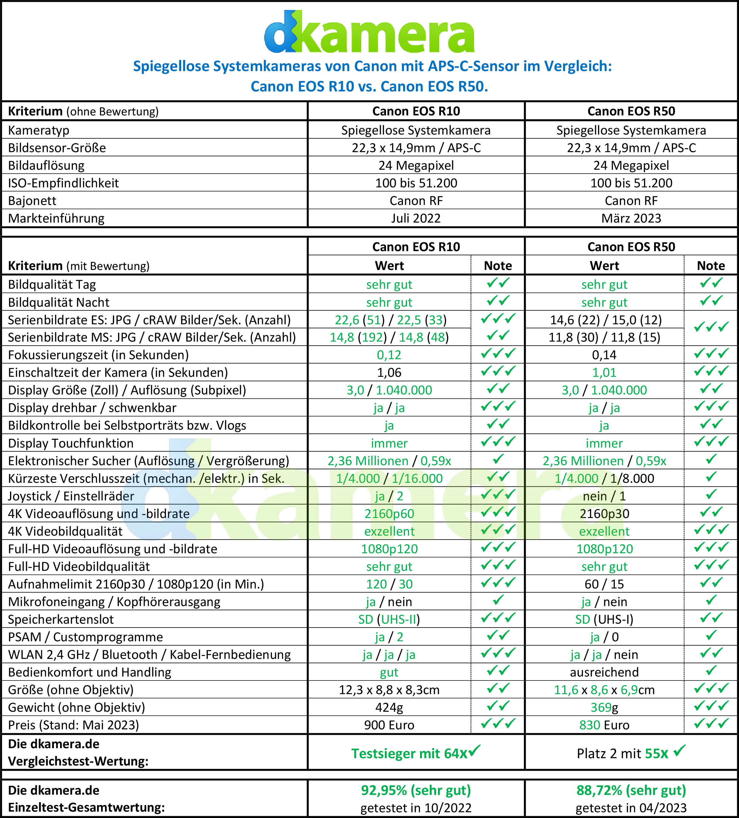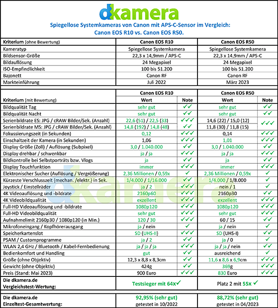 Seit dem Sommer 2022 bietet Canon auch APS-C-Kameras mit dem RF-Bajonett an. Dieser Schritt wurde lange erwartet, Canon hat sich damit aber Zeit gelassen. Neben der EOS R7, die das High-End-Modell mit APS-C-Chip darstellt, gehören zum Portfolio auch die Einsteiger- bis Mittelklassemodelle Canon EOS R10 und EOS R50. Wie sich beide Kameras unterscheiden, erläutern wir in diesem Vergleichstest.