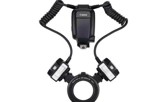 Canon löst mit dem MT-26EX-RT den MT-24EX ab und bietet damit einen neuen, leistungsfähigeren Zangenblitz an, der für Aufnahmen in der Produkt- und Makrofotografie bestens geeignet sein soll. Der MT-26EX-RT besitzt zwei einstellbare Blitzköpfe, die in Schritten von fünf Grad gedreht werden können. Canon gibt die Blitzleistung mit einer Leitzahl von 26 bei ISO 100 an, die Belichtung wird per E-TTL oder manuell von 1/1 bis 1/512 in Drittelstufen gesteuert. Mittels zweier Bounce-Adapter kann die Belichtung optimiert werden.