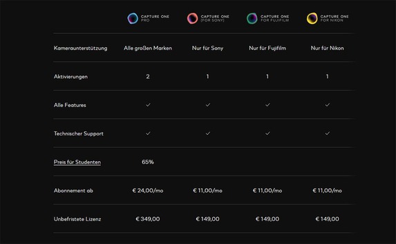 Dies betrifft vor allem die Lizenzen der speziellen Hersteller-Versionen, mit denen sich jeweils nur die RAW-Bilder bestimmter Kameras (von FujiFilm, Nikon oder Sony) bearbeiten lassen. Beim einmaligen Kauf sollen statt 149,00 Euro ab dem 11. Januar 229,00 Euro fällig werden, das Jahresabonnement wird bei jährlicher Zahlung 169,00 Euro statt 109,00 Euro kosten. Wer von einer älteren Version auf die neueste Version upgraden will, muss ebenfalls 169,00 statt 109,00 Euro zahlen. Bei monatlicher Zahlungsweise und Kündigungsmöglichkeit soll der Preis von 18,00 Euro auf 23,00 Euro ansteigen, bei einem Jahresabonnement mit monatlicher Zahlung sind es 18,00 Euro statt 11,00 Euro.