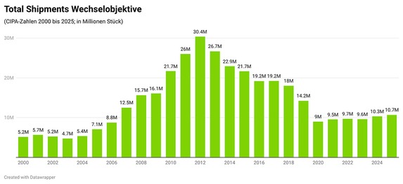 Nur eine leichte Steigerung gab es dagegen bei den ausgelieferten Objektiven. Mit 10,6 Millionen wurden knapp 300.000 Stück mehr als 2024 abgesetzt. Pro verkaufter Kamera ergab sich mit 1,5 abgesetzten Objektiven jedoch ein neuer Mehrjahres-Negativwert. Dieser Rückgang dürfte nicht nur auf gestiegene Preise (auch bedingt durch eine höhere Stückzahl von höherwertigen Modellen) zurückzuführen sein, sondern auch auf das immer größere Angebot von chinesischen Herstellern. Deren Verkaufszahlen umfassen die CIPA-Statistiken nämlich nicht.