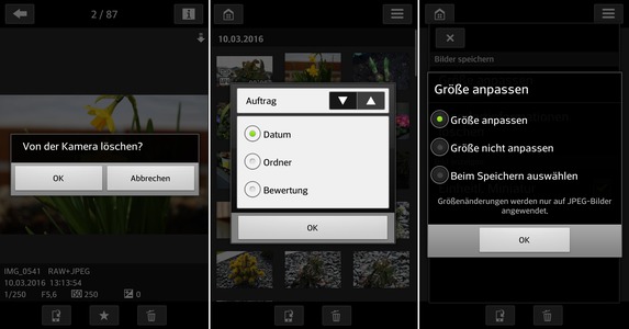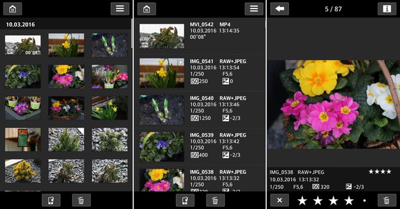 War die Verbindungsaufnahme erfolgreich, kann man die App starten. Hier erwartet einen die Startseite der Camera Connect App. Diese bietet vier Wahlmöglichkeiten. Der erste Punkt nennt sich „Bilder auf Kamera“ und erlaubt das Betrachten der Aufnahmen, die sich auf der Speicherkarte in der Kamera befinden. Die Bilder lassen sich sortieren, vergrößern, bewerten und auf das Smartphone herunterladen. Zudem kann man Aufnahmen löschen. Gut: Bei der vergrößerten Ansicht werden die Aufnahmeparameter angezeigt.