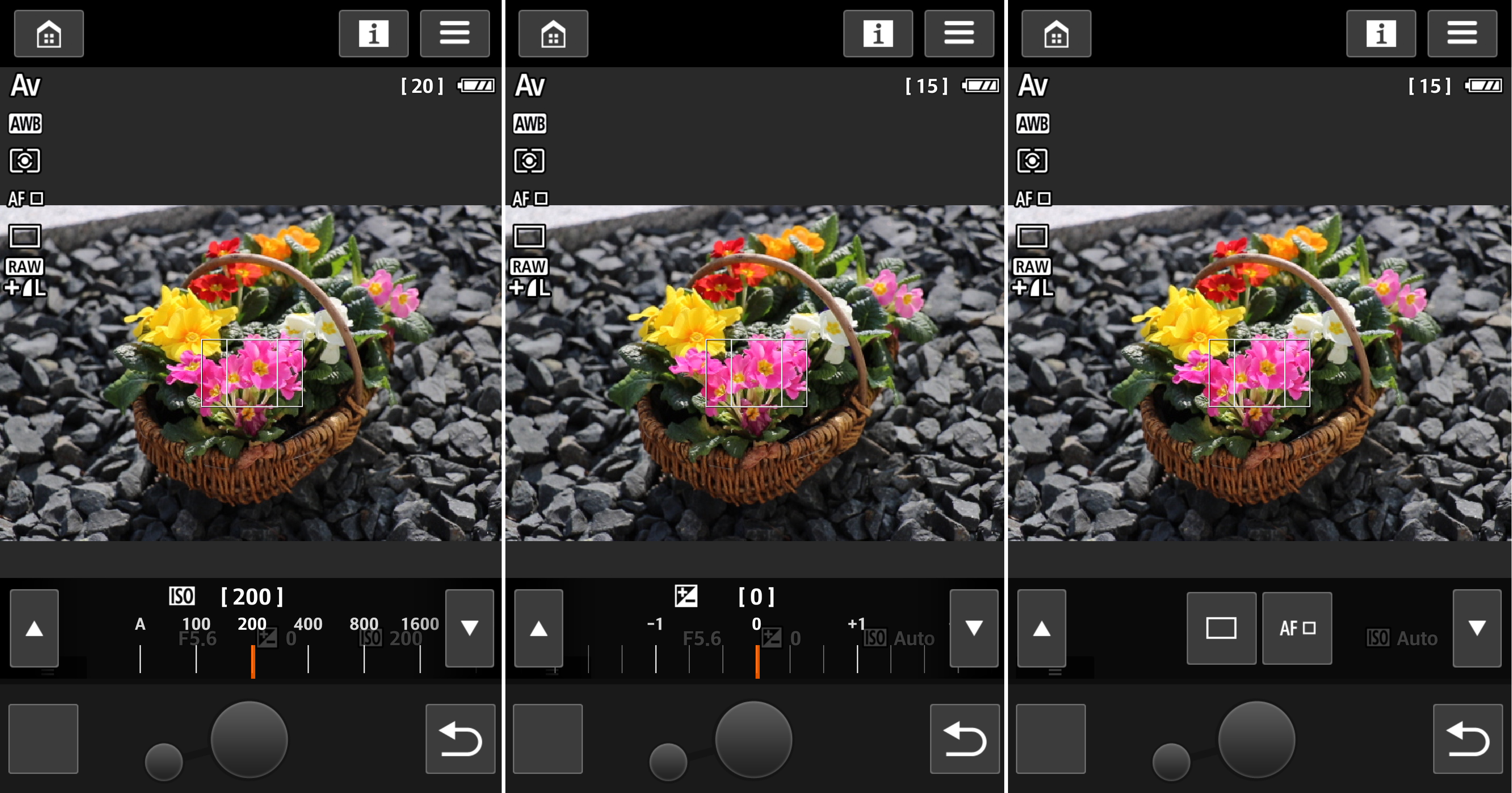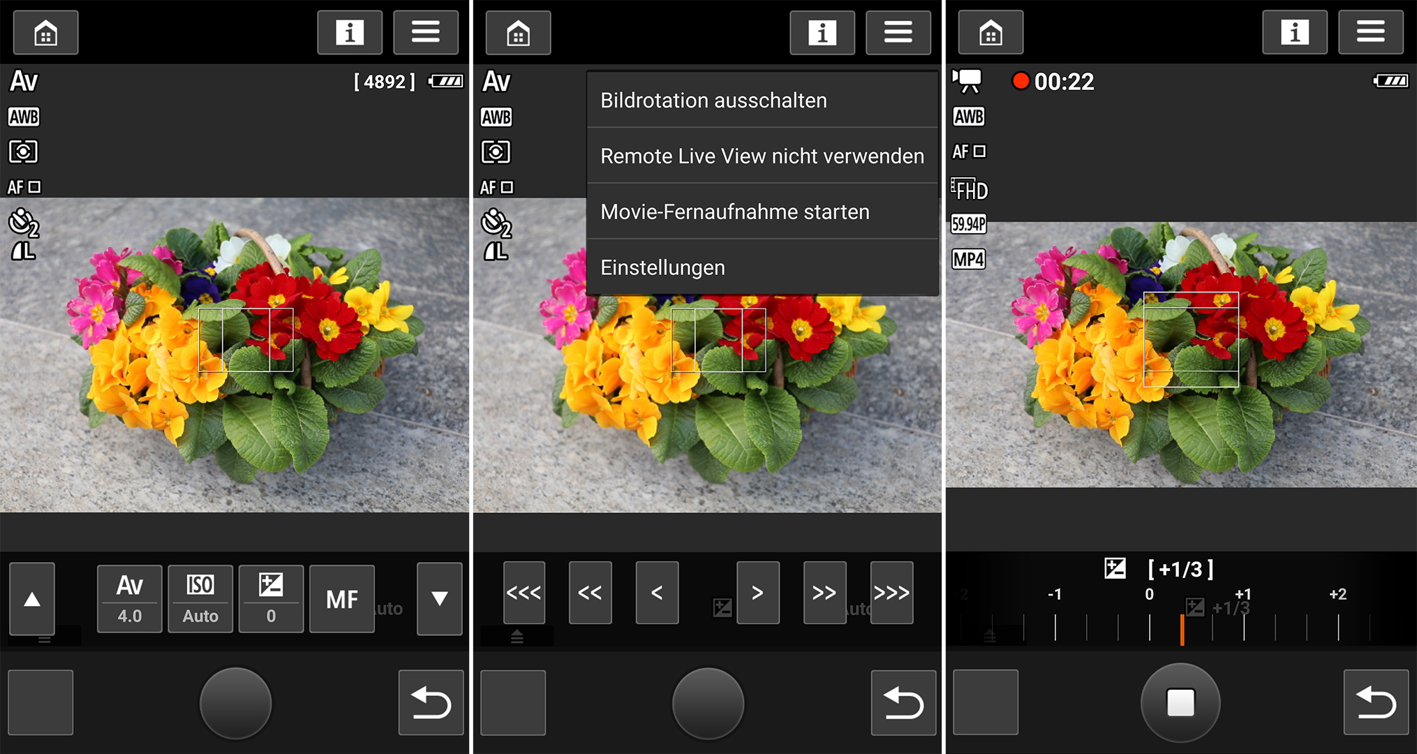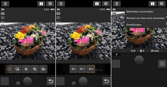 Wichtig: Sofern die Kamera ein Objektiv mit Motor besitzt, kann über die App auch die Brennweite verändert werden. Da wir die App mit der Canon EOS 760D getestet haben, wird diese Funktion hier nicht angeboten. Auf den Bildern sind deshalb auch keine Tasten zum Zoomen zu sehen.