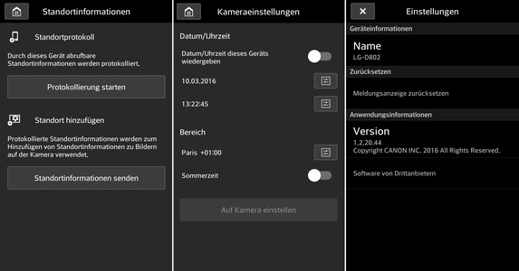 Hinter dem Punkt „Standortinformationen“ verbirgt sich die Möglichkeit, die aufgenommenen Bilder mit Geopositionsdaten zu versehen. Diese Funktion ist für Kameras ohne integrierten GPS-Empfänger gedacht. Sofern das Mobilgerät über einen GPS-Empfänger verfügt, lassen sich die Positionsdaten mit der App aufzeichnen (= „Protokollierung starten“) und danach über „Standortinformationen senden“ zur Kamera übertragen.