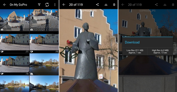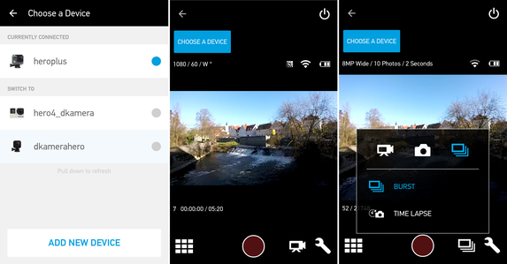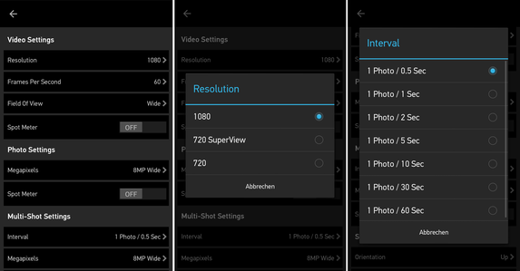 In der App muss die GoPro HERO+ einmal eingerichtet werden, danach ist eine schnelle Verbindungsaufnahme möglich. Die App kommt in dieser Ausführung auch bei anderen GoPro-Modellen zum Einsatz und bietet ein Livebild mit zahlreichen Aufnahmeinformationen sowie auch einen Ein- und Ausschalter für die Actionkamera. Ebenso kann man in der App den Aufnahmemodus wählen sowie verschiedene Einstellungen vornehmen. Wie bereits im Kameramenü lassen sich unter anderen die Auflösung und die Bildrate (jeweils bei Video) vorgeben. Zudem kann man die Intervallaufnahme konfigurieren oder auch die Spotbelichtungsmessung aktivieren.